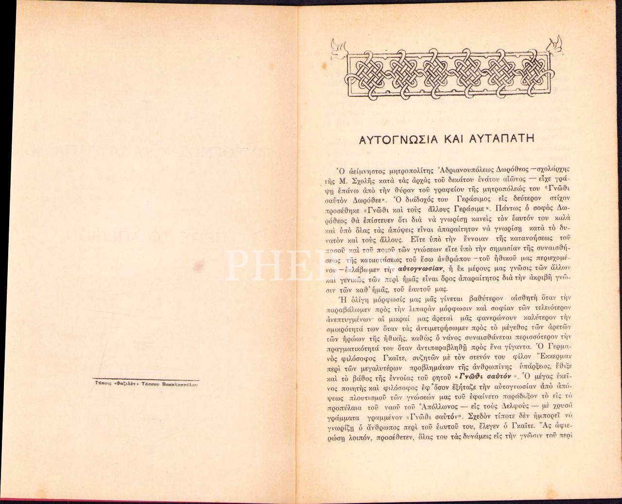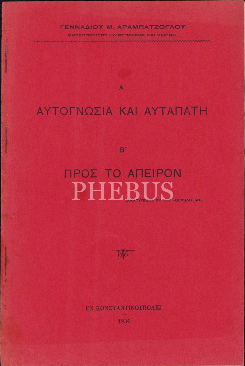 Rumca Α` Αυτογνωσια και αυταπατη(1.Bölüm:Kendini Tanıma ve Yanılsama), Β` Προς Το Απειρον(2.Bölüm:Sonsuzluğa), Gennadios M.Arabacıoğlu, Constantinople 1934, 13 s., 15x23 cm, kapağı hafif yıpranmış haliyle