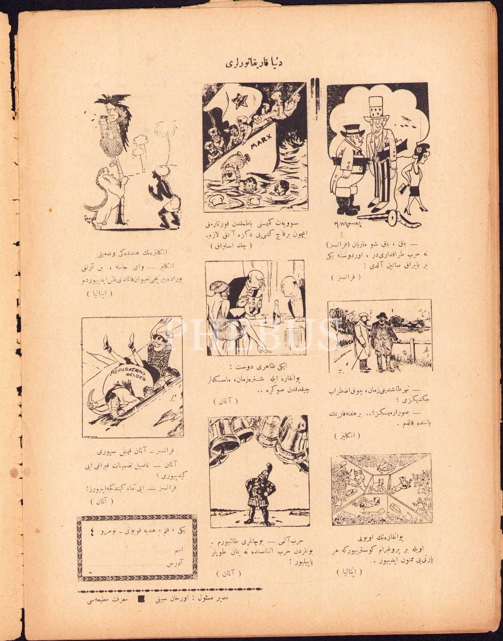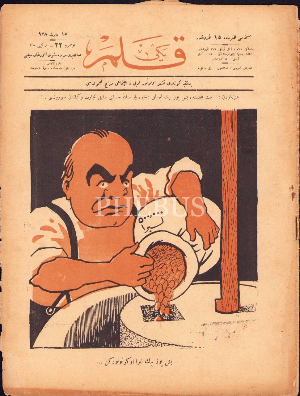 Osmanlıca Yeni Kalem mizah dergisi 22. sayı, 15 Mart 1928, "Beş yüz bin lira öğütülürken" başlıklı ön kapak görseliyle, 23x31 cm, kapağı yıpranmış haliyle