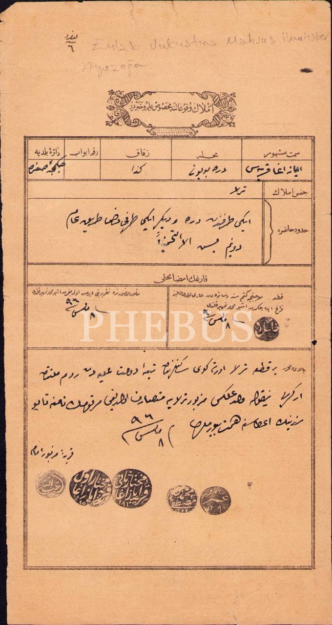 Osmanlıca tarla ferağ ilmühaberi, Ayazağa Köyü 1296, 16x31 cm, kenarları yırtılmış haliyle