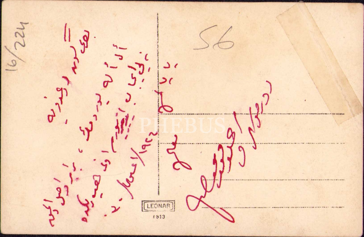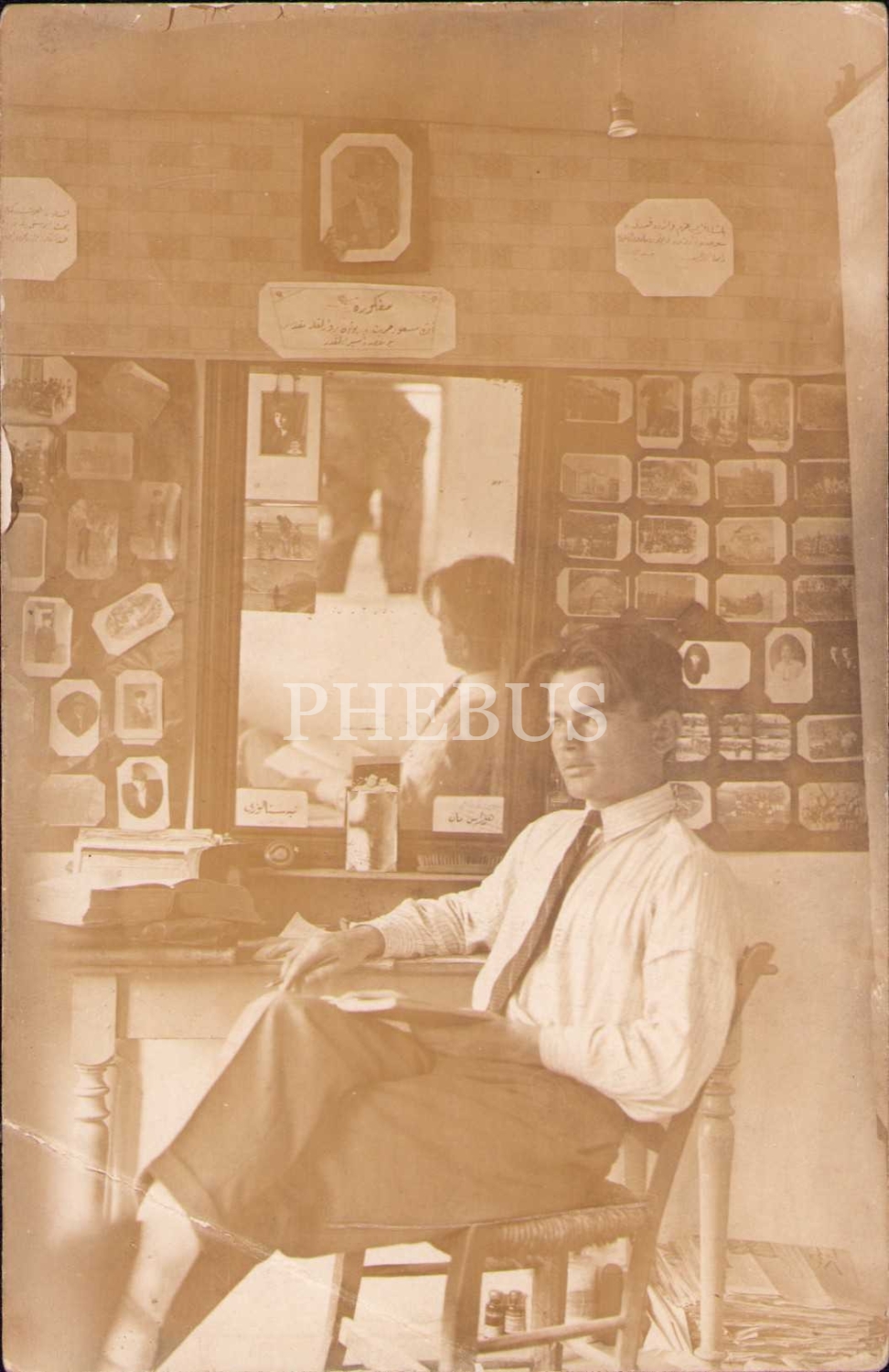 Atatürk portresi ile çeşitli fotoğrafların asılı olduğu odada şahıs hatıra fotoğrafı, arkası Osmanlıca yazılı ve 1926 tarihli, alt köşesi kırık haliyle