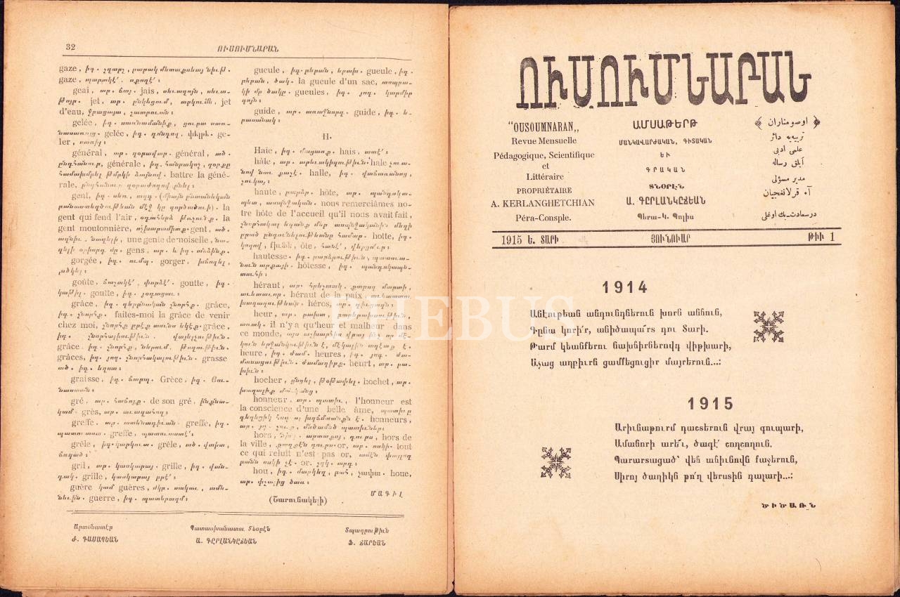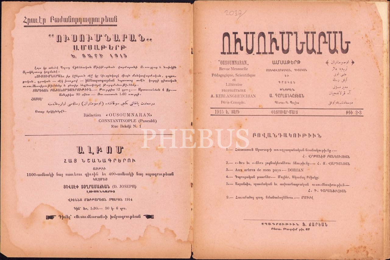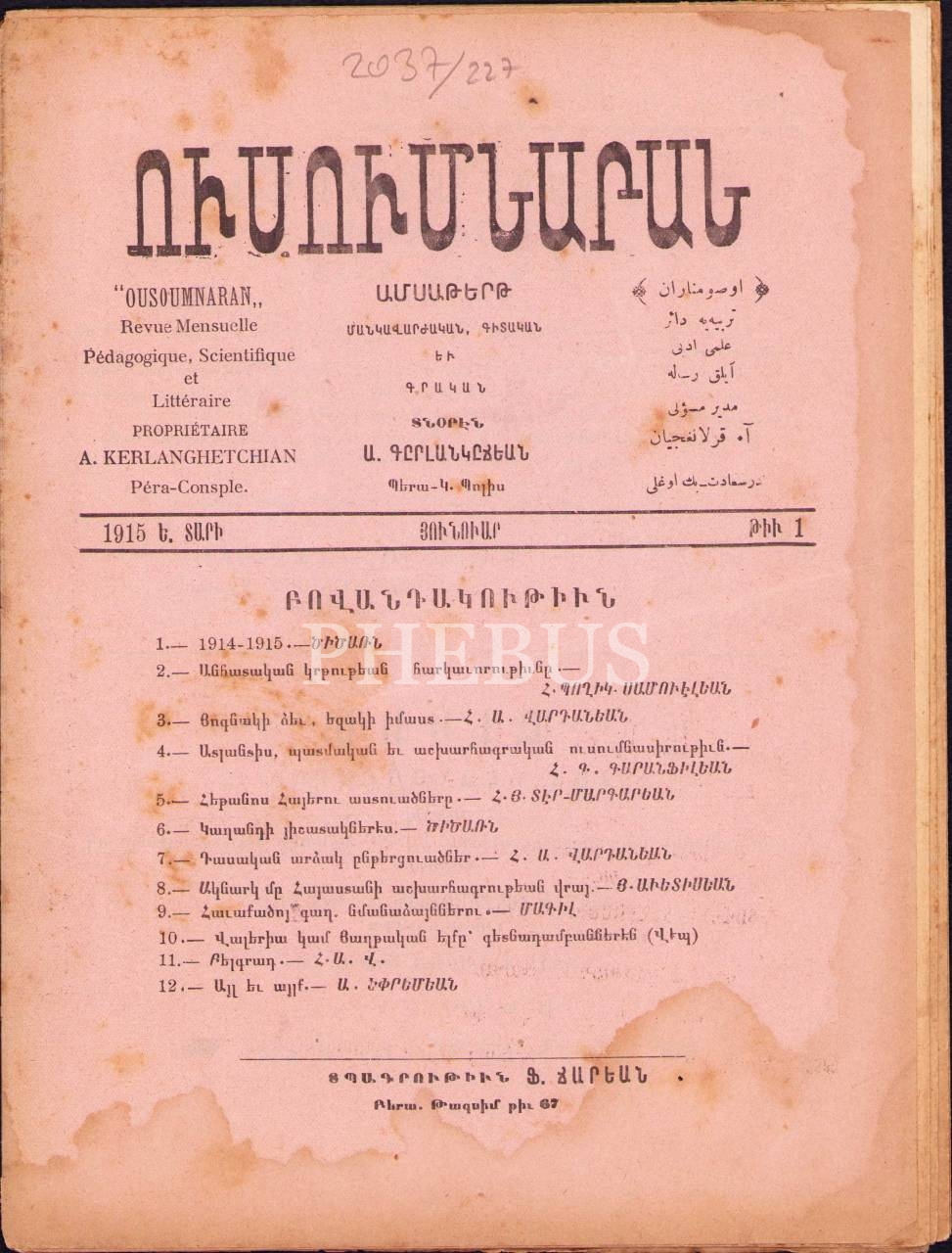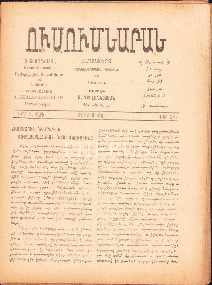 1915 tarihli 2 adet Ermenice "Ousoumnaran" dergisi [Okul Dergisi]-Kırlangıçyan, A.- Müdür, 1-3. sayılar, Pera/Constantinople, 19x25 cm, sayfaları açılmamış ve kapak sayfası lekelenmiş haliyle