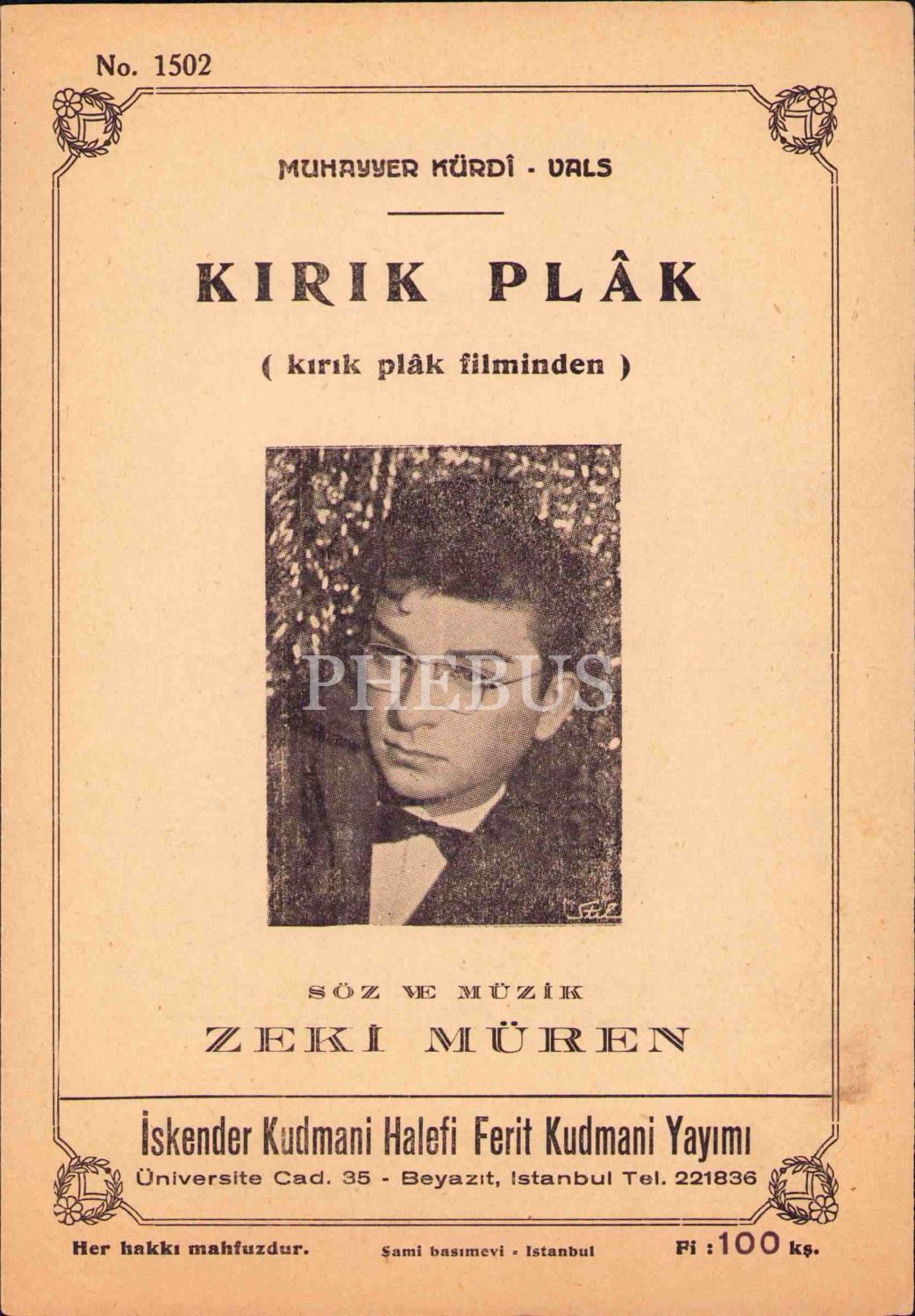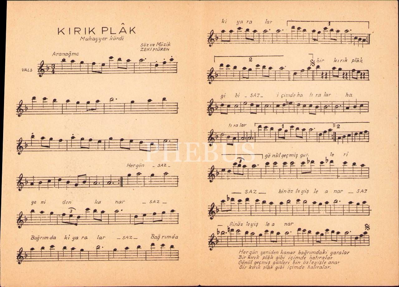 Söz-müziği Zeki Müren'e ait Kırık Plâk notası, İskender Kudmani Halefi Ferit Kudmani Yayımı, İstanbul, 14x20 cm