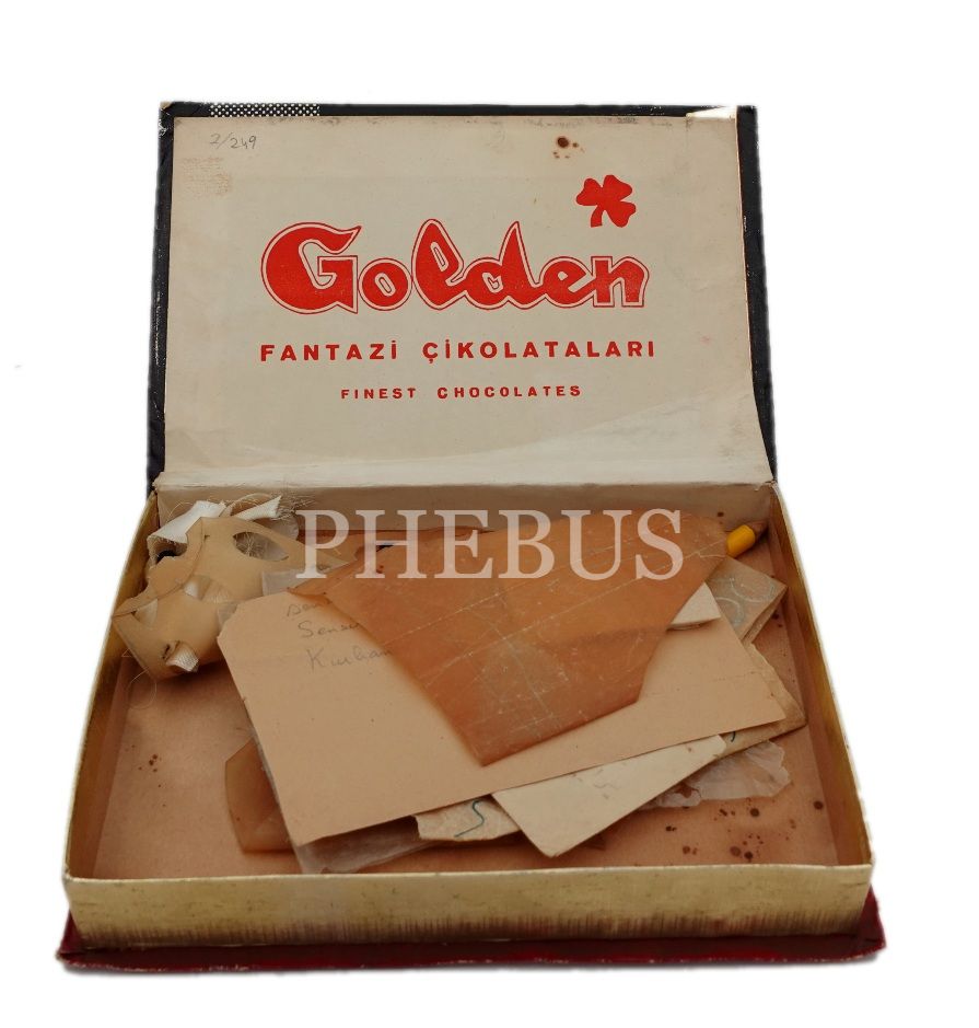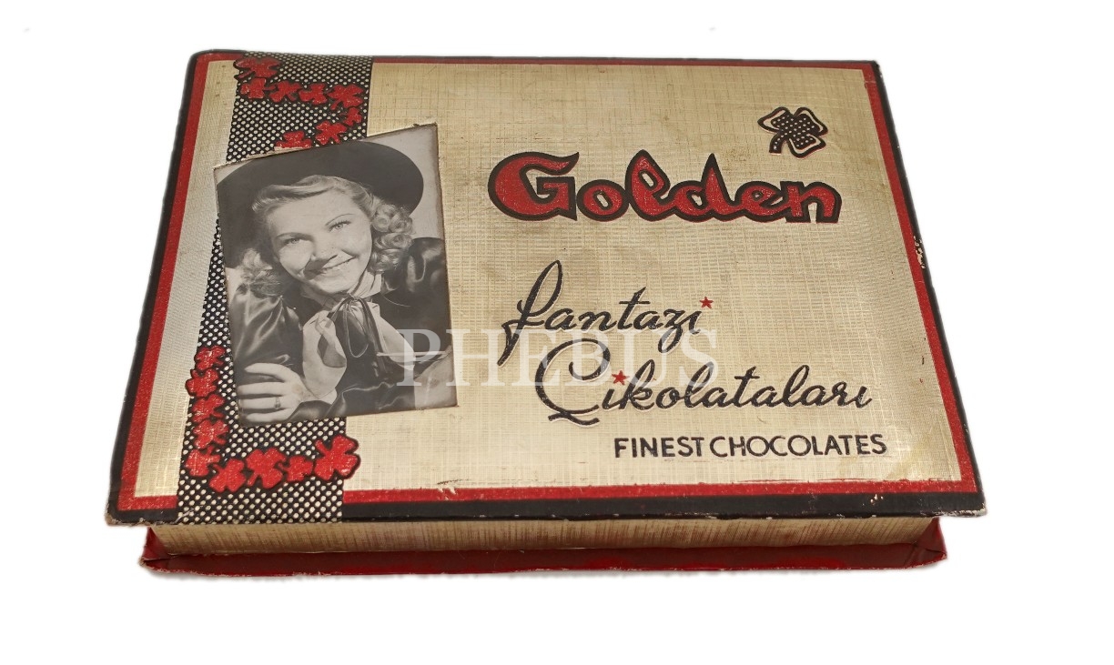 Golden Fantezi Çikolataları'na ait boş karton kutu, kapak sırtı haliyle, 4x16x22 cm