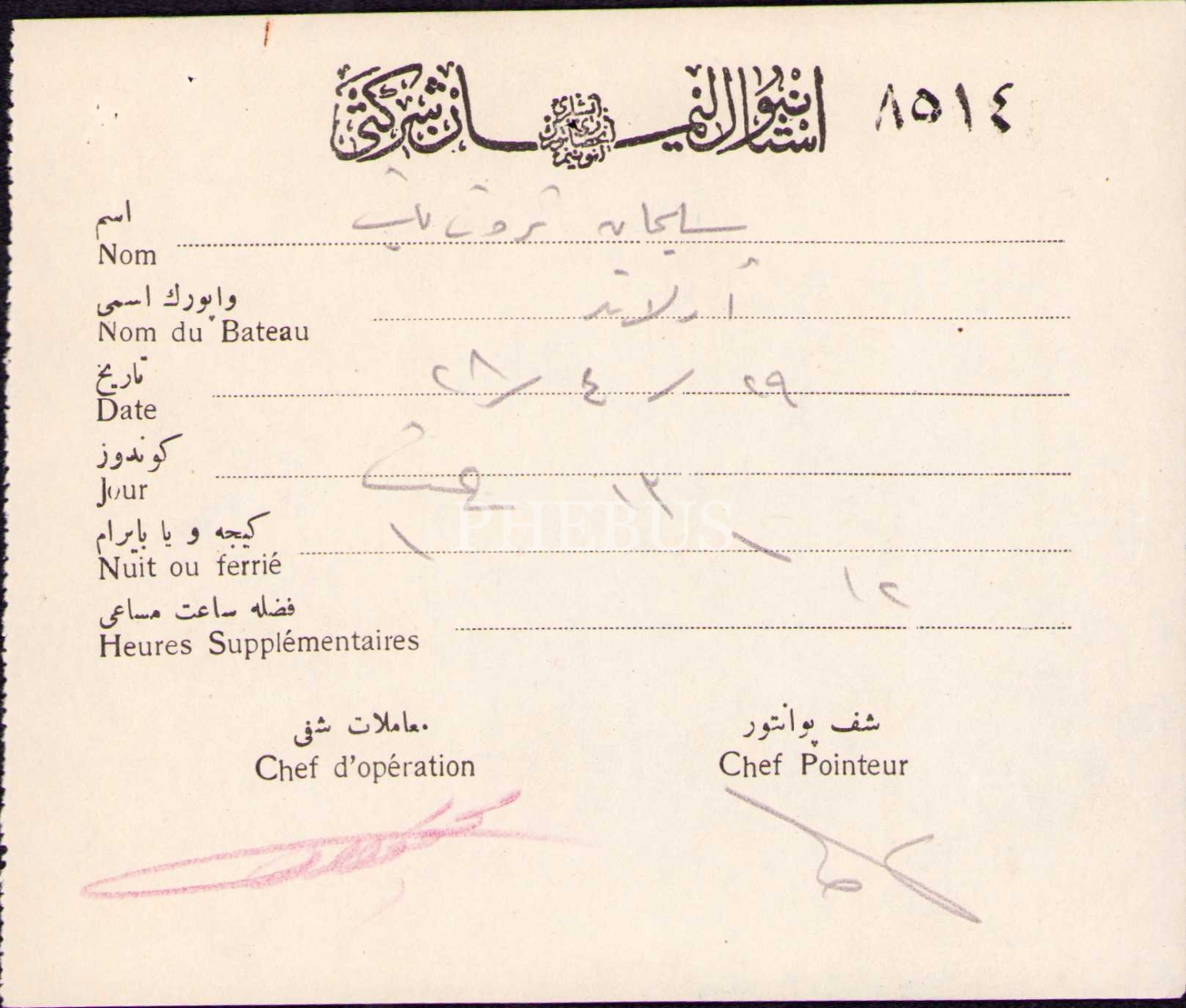 Osmanlıca İstanbul Liman Şirketi antetli mesai bilgi kâğıdı, 1328 tarihli, 11x13 cm