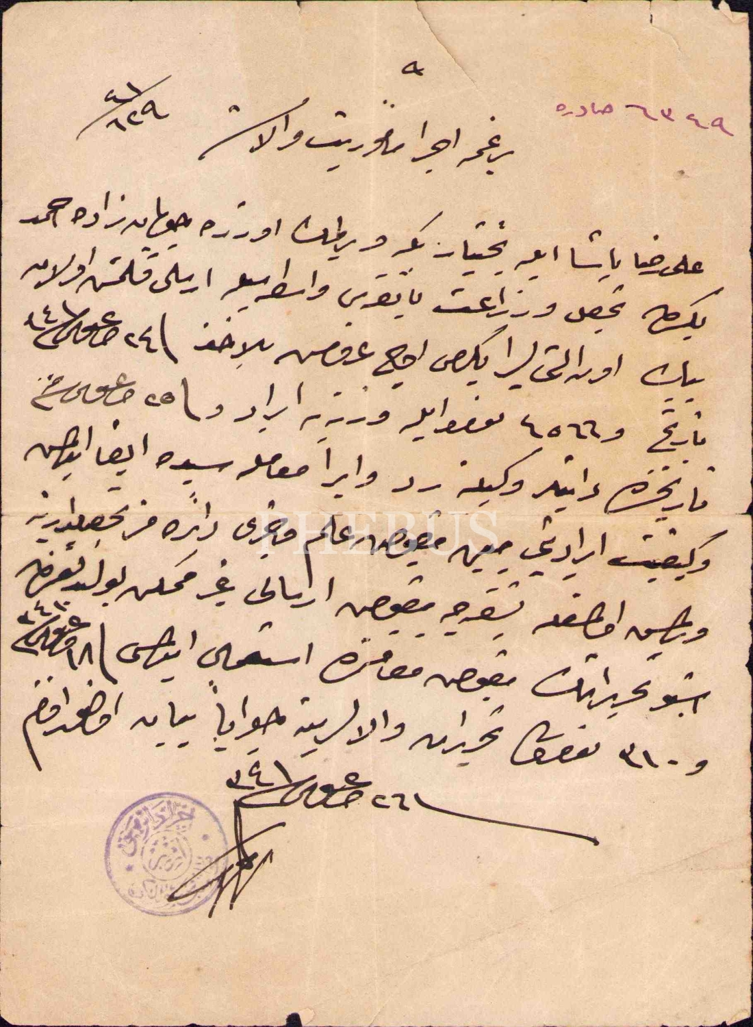 Bergama İcra Memurluğu'na gönderilmiş 1341 tarihli Osmanlıca makbuz, 15x21 cm, yıpranmış haliyle