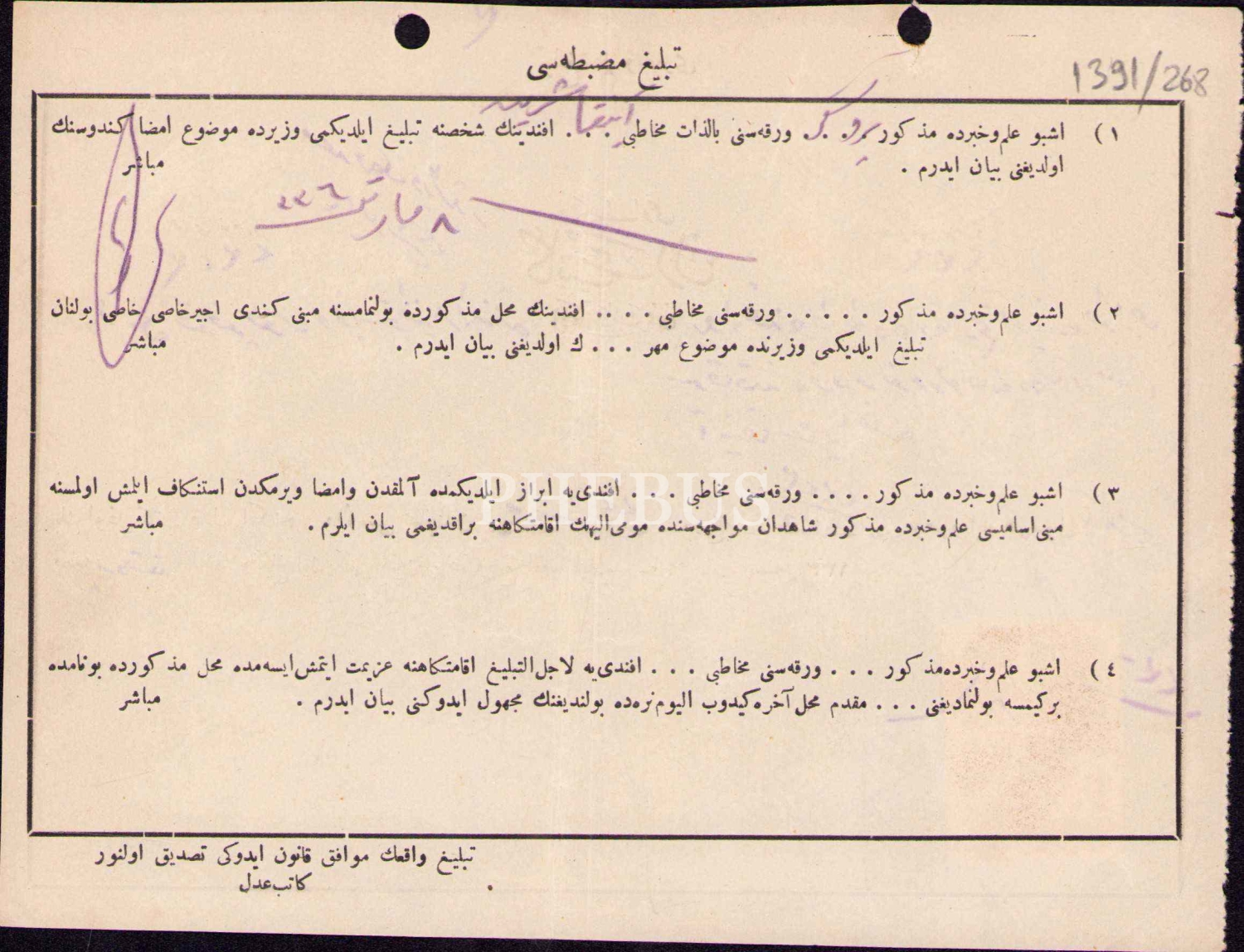 Osmanlıca Beyoğlu Katibiadl [Noter] antetli ve Tatavla'da Madam ? Şirinoğlu'na gönderilmiş 1336 tarihli tebliğ ilmühaberi, 15x19 cm