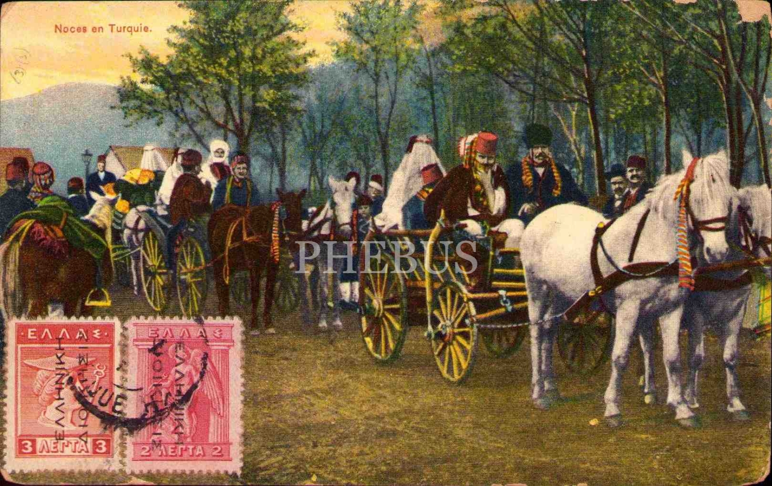 Türkiye'de düğün görselli ve postadan geçmiş kart, Albert Beraha-Salonique damgalı, köşeleri soyulmuş haliyle