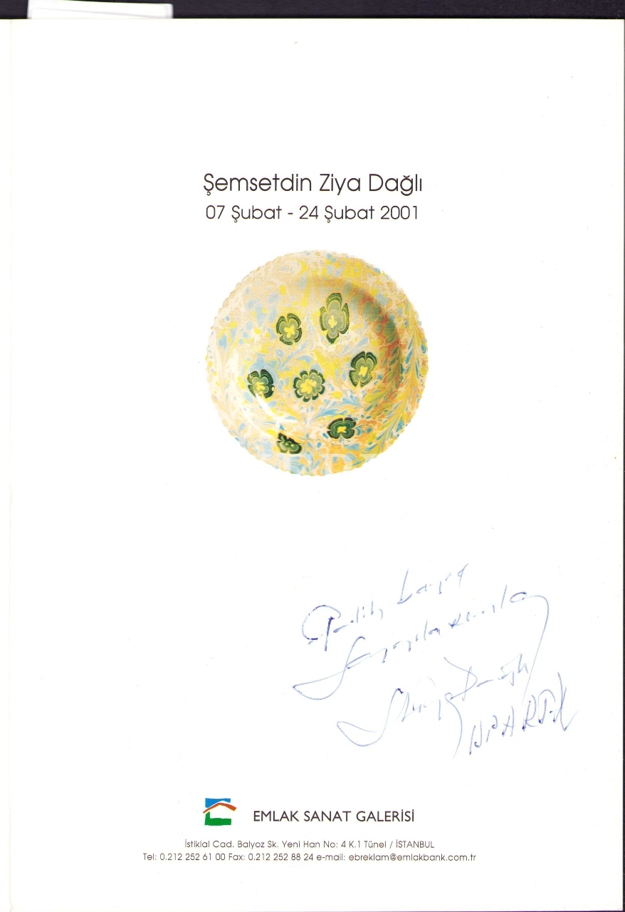 Şemsetdin Ziya Dağlı [Resim sergisi kataloğu], Ziya Dağlı'dan ithaf ve imzalı, Emlak Sanat Galerisi, İstanbul 2001, 32 s., 21x30 cm
