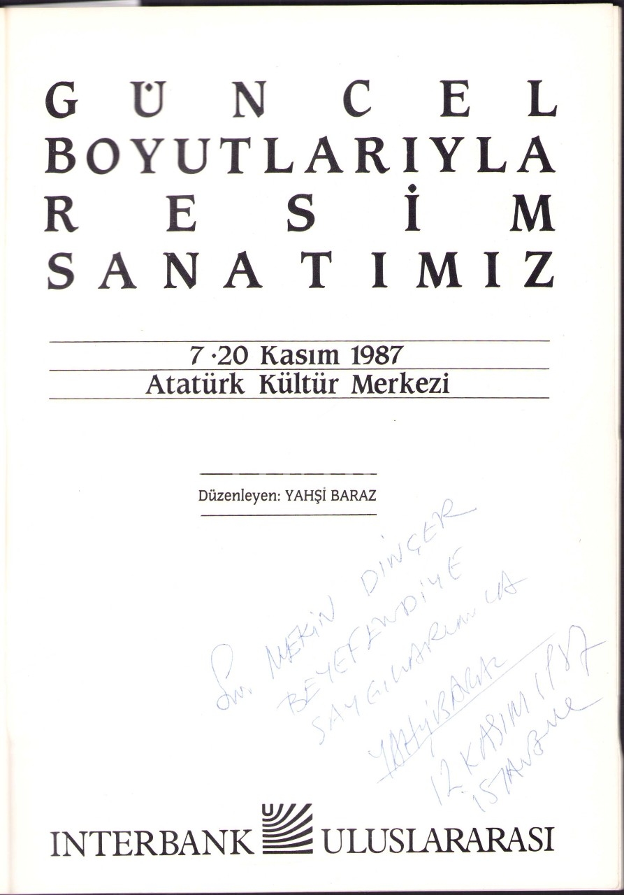 Güncel Boyutlarıyla Resim Sanatımız [Sergi kataloğu], düz. Yahşi Baraz, ithaf ve imzalı, Interbank Uluslararası, İstanbul 1987, 21x30 cm