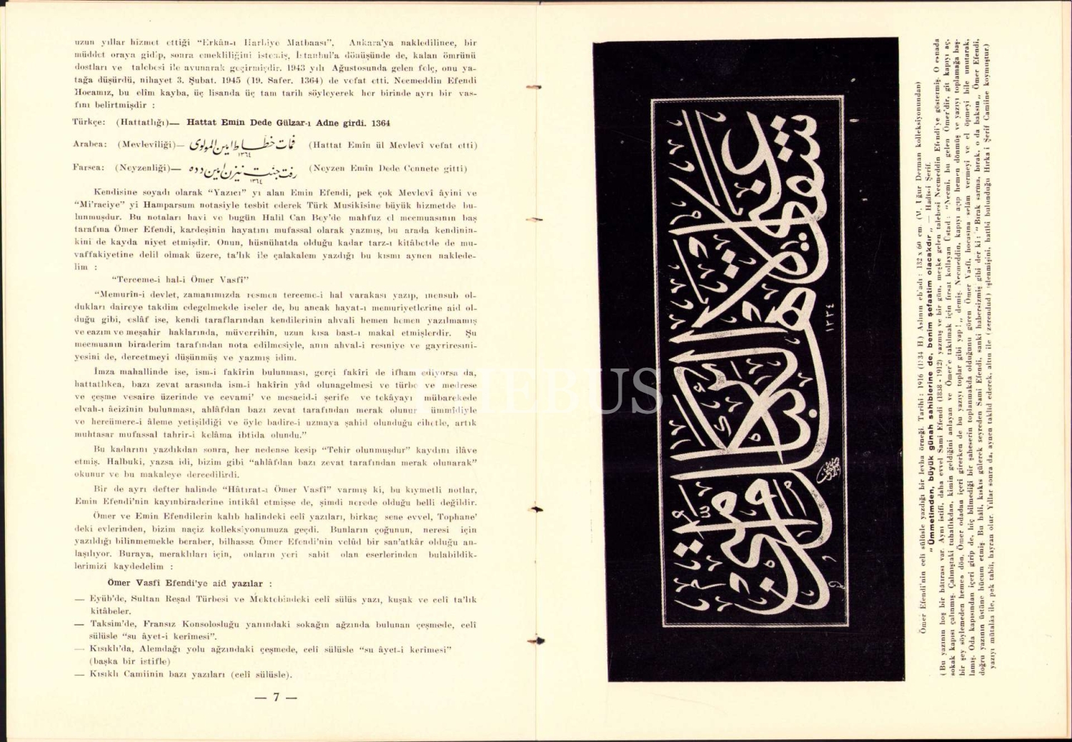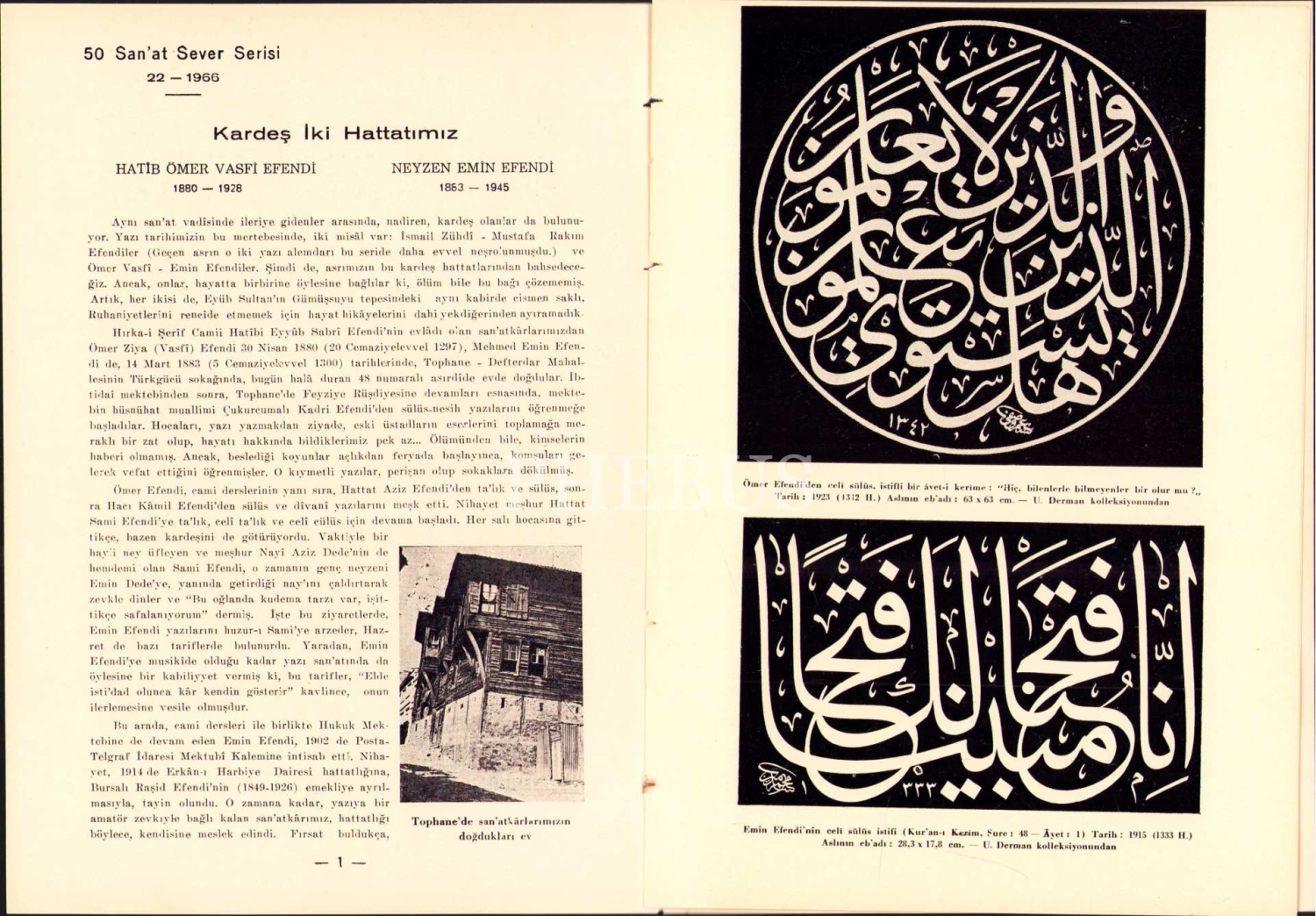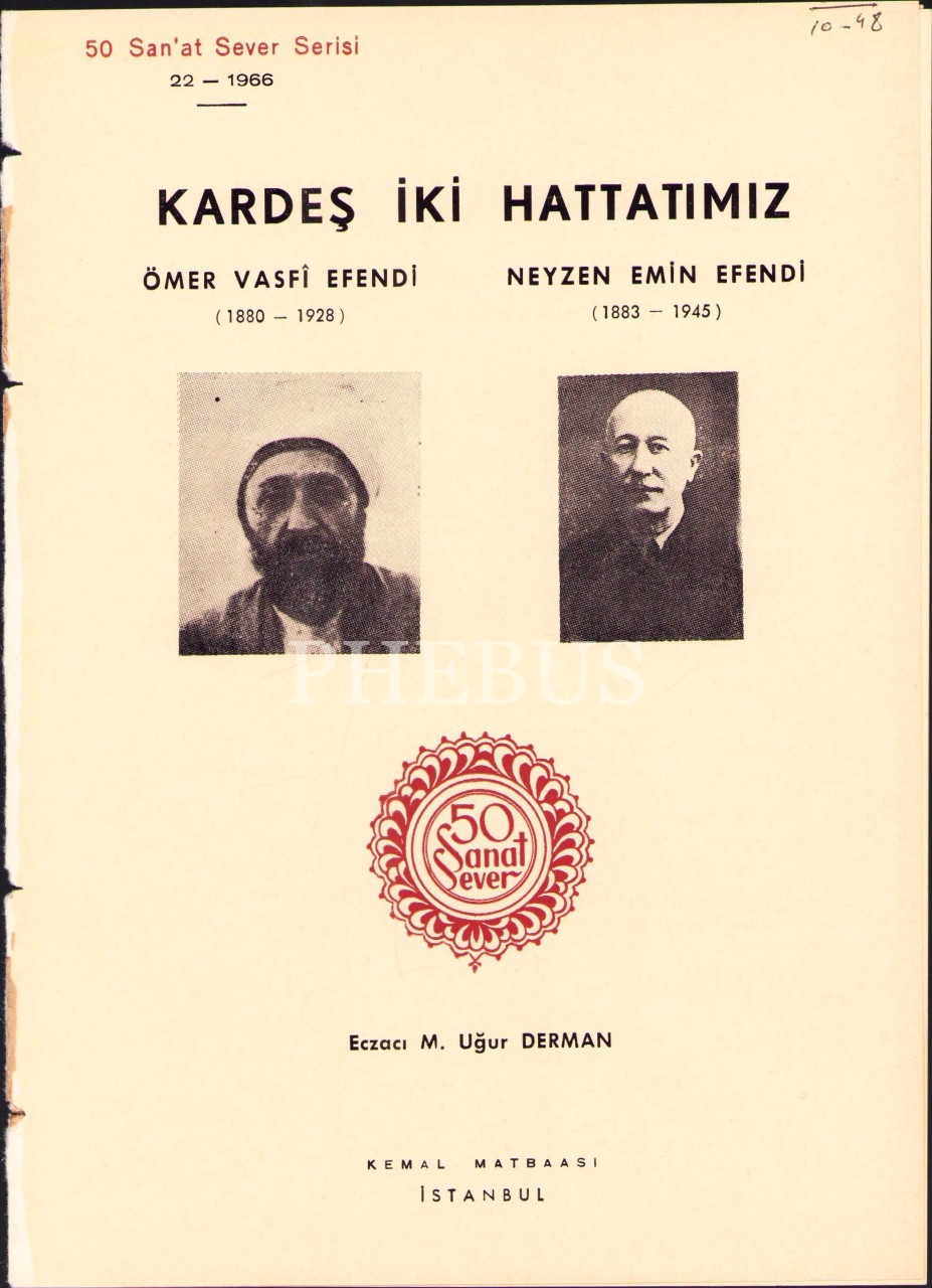 Kardeş İki Hattatımız "Ömer Vasfi Efendi (1880-1928)-Neyzen Emin Efendi (1883-1945)", Eczacı M. Uğur Derman, 50 Sanat Sever Serisi 22 numara, İstanbul 1966, 16x23 cm