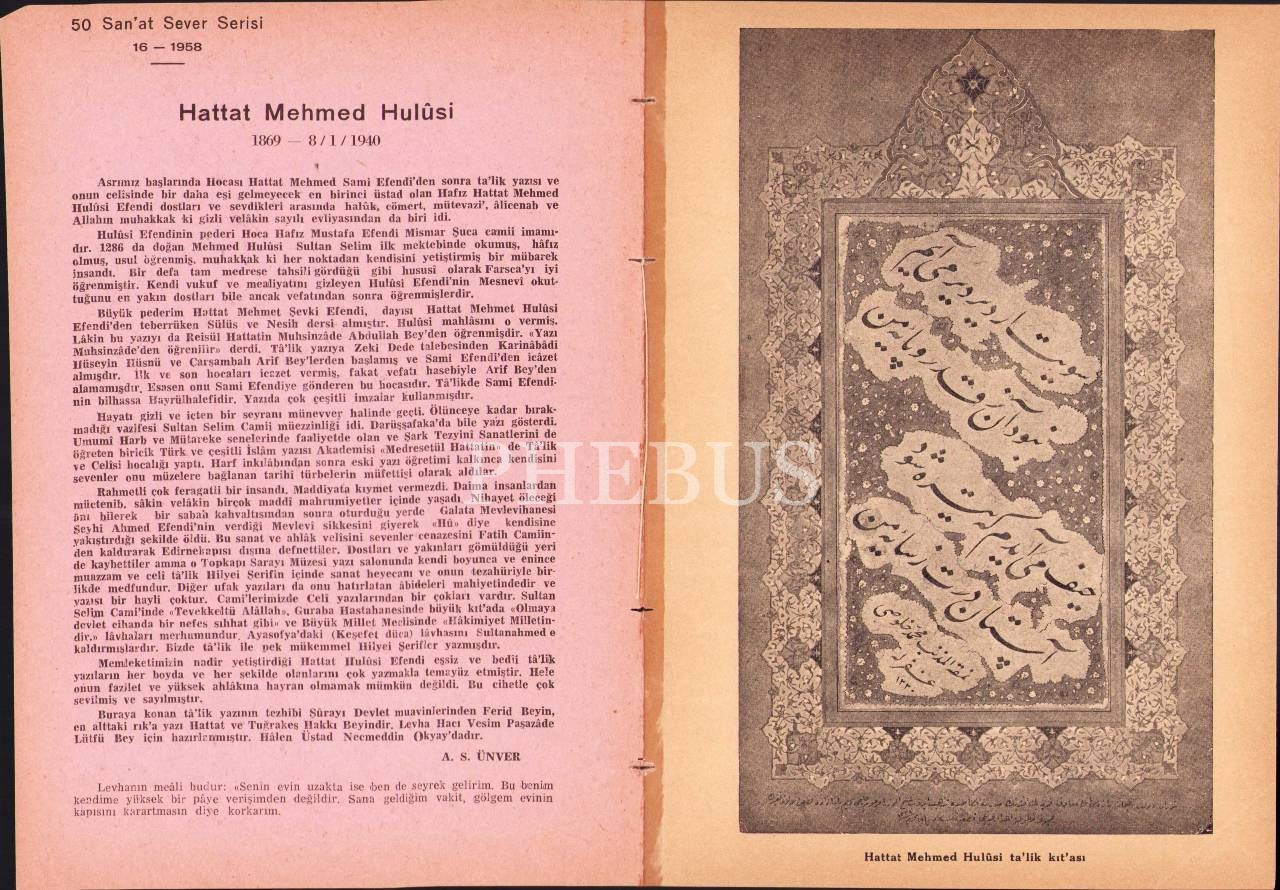 Hattat Mehmed Hûlusi (1869-1940), A. Süheyl Ünver, 50 Sanat Sever Serisi 16 Numara, İstanbul 1958, 16x23 cm