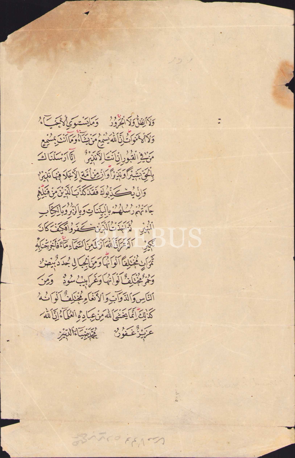 Nesih Yazıyla Fâtır Suresi 21-28. Ayetler, yırtık ve kopuk haliyle, 13x21 cm