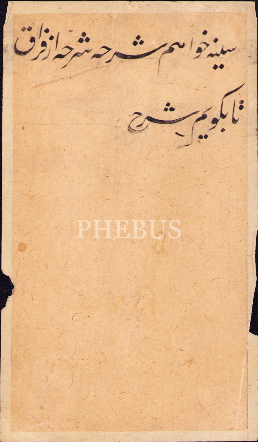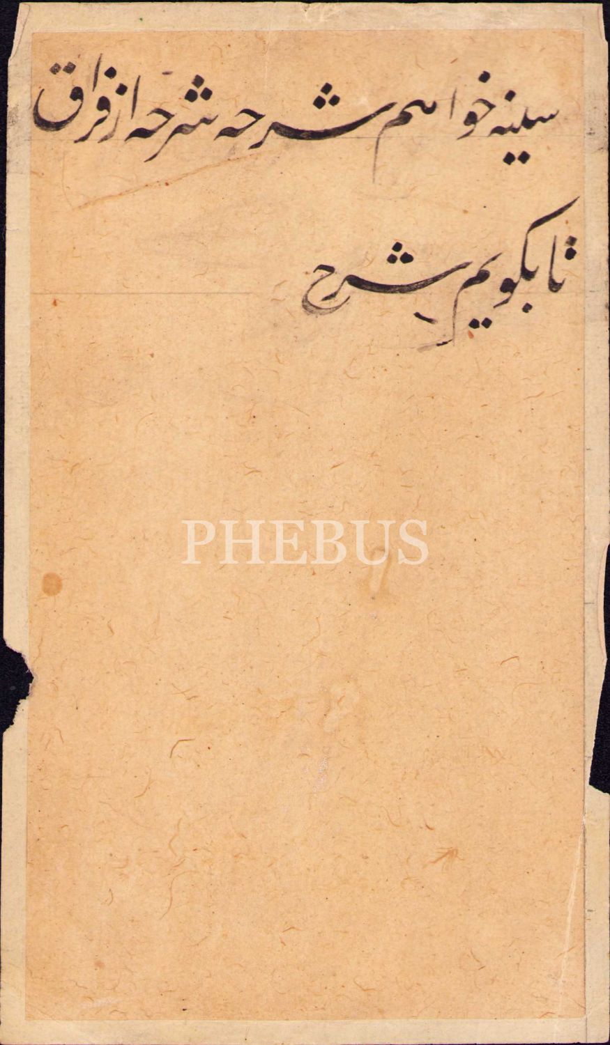 Ta'lik Meşk, Mevlana'ya ait Farsça beyit: "Sine hahem şerha şerha ez firak, Ta biguyem şerh-i...[Özlem derdini şerh edebilmem için ayrılık acılarıyla kesik kesik olmuş bir gönül isterim] ", kenarından kopuk haliyle, 12x21 cm