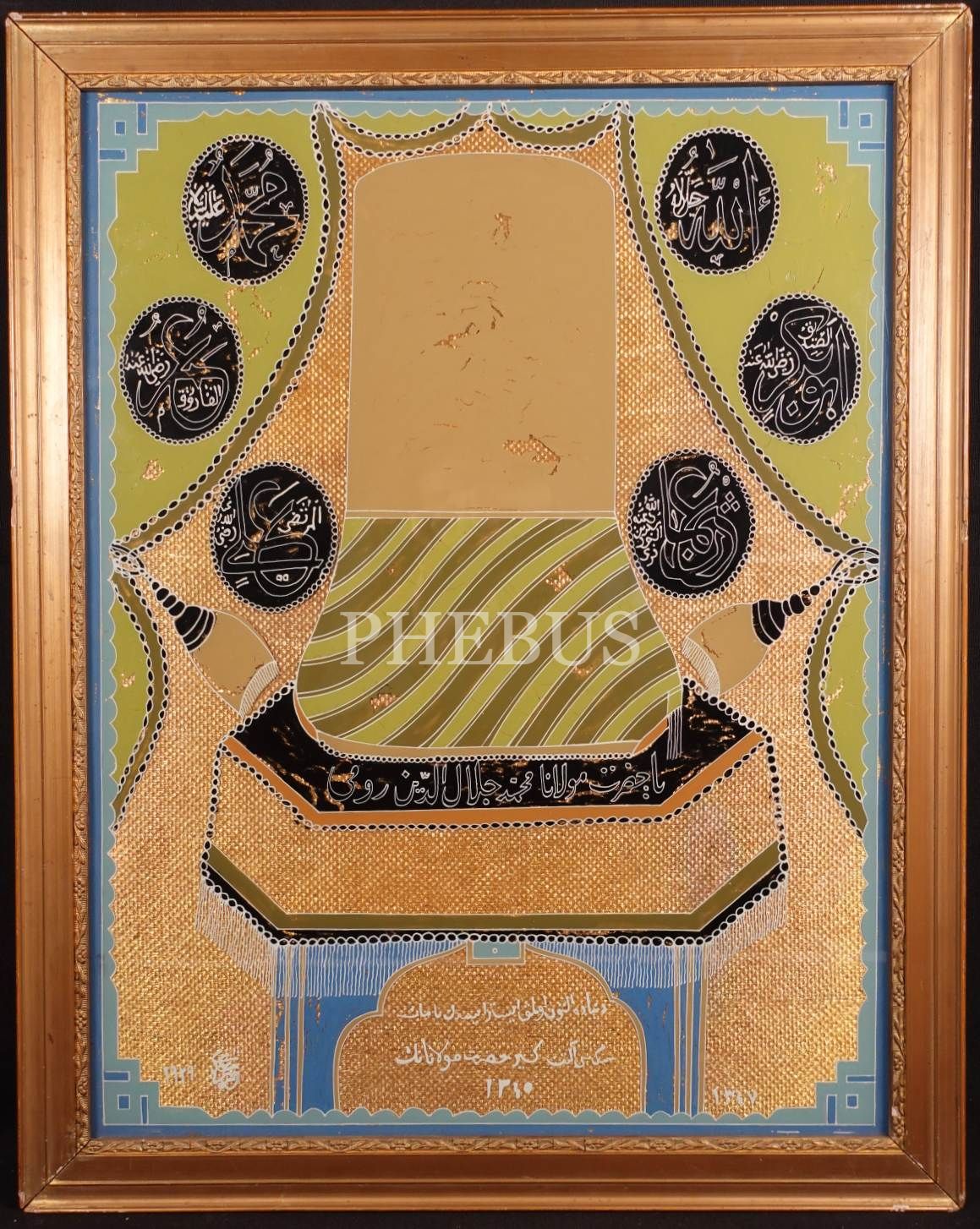 Mevlevi Destar'ı Motifli Cam Altı Levha, Çehar yar-ı güzin adları, "Ya Hazreti Mevlana Celaleddin Rumi" ve "Dü cihânda altun ola dirsen nâmın, Sikkesi altına gir Hazret-i Mevlanâ'nın" yazıları, 1345 tarihli, 56x42 cm