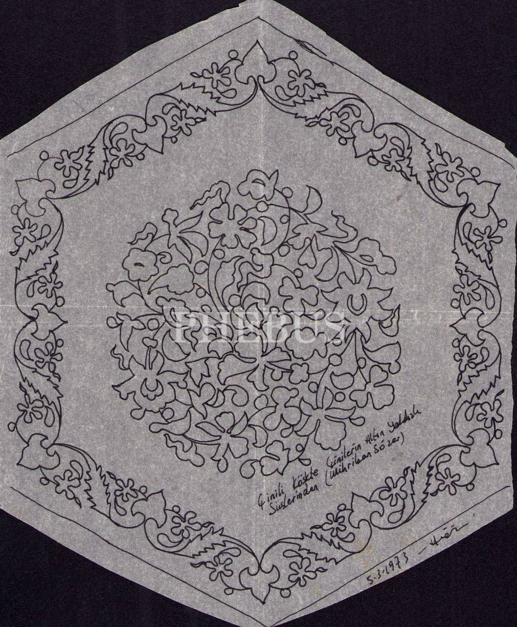 Üzerinde "Çinili Köşk'ta çinilerin altın yaldızlı süslerinden (Mihriban Sözer) 5.3.1973- İmza" notu bulunmakla birlikte, imza okunamamaktadır.
