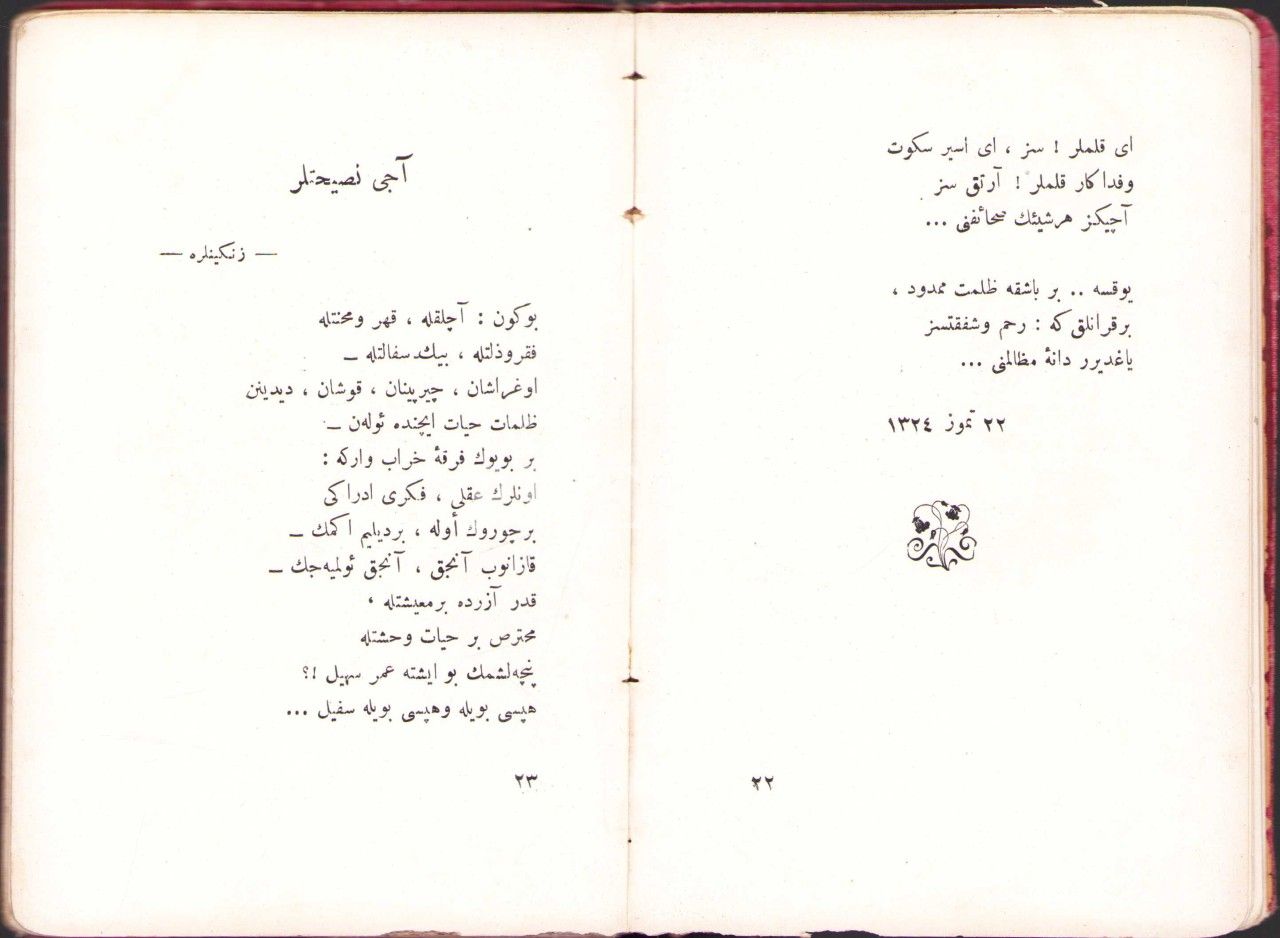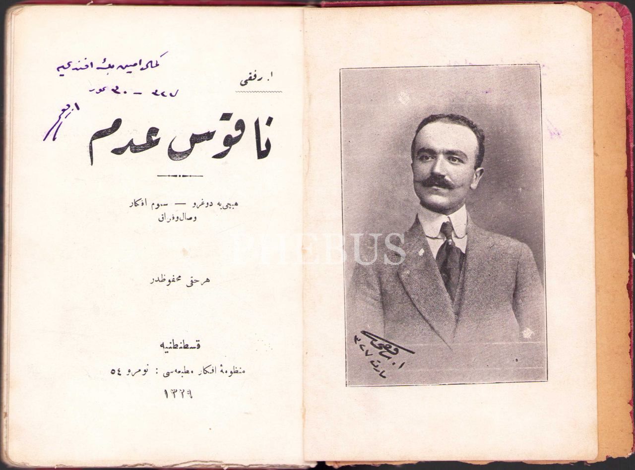 Ahmet Rıfkı'dan İthaflı ve İmzalı Osmanlıca "Nakûs-ı Adem" Şiir Kitabının İlk Baskısı, Konstantiniyye Manzume-i Efkar Matbaası 1329, 95 sayfa, cilt yüzeyi, sırtı ve kenarları yıpranmış haliyle, 12x18 cm