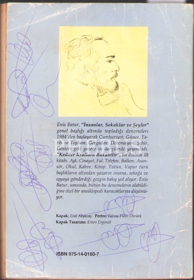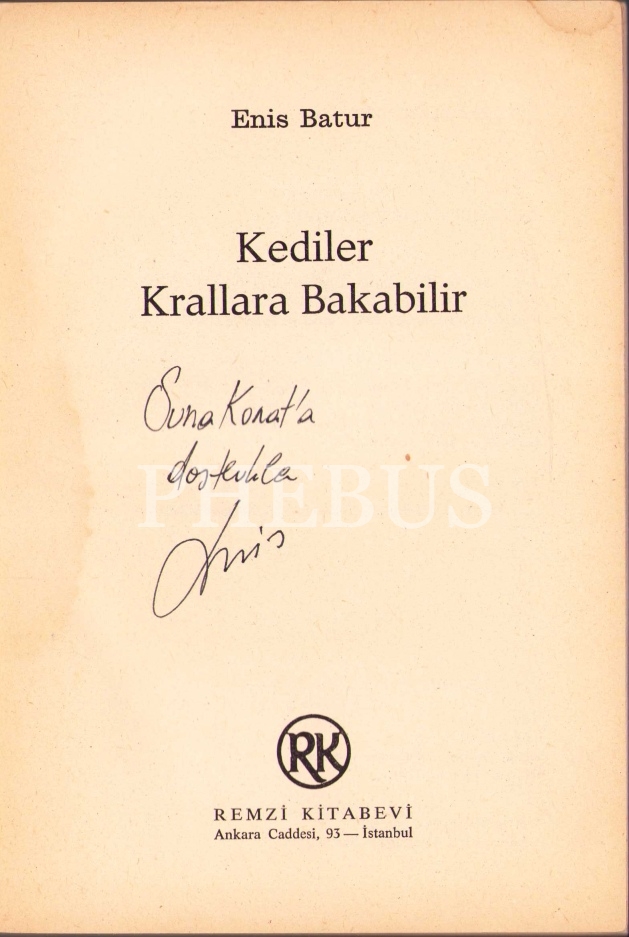 Enis Batur'dan Opera Sanatçısı Suna Korat'a İthaflı ve İmzalı "Kediler Krallara Bakabilir" Denemesi, Remzi Kitabevi 1990, 192 sayfa, ön ve arka kapağı çizilmiş haliyle, 14x20 cm