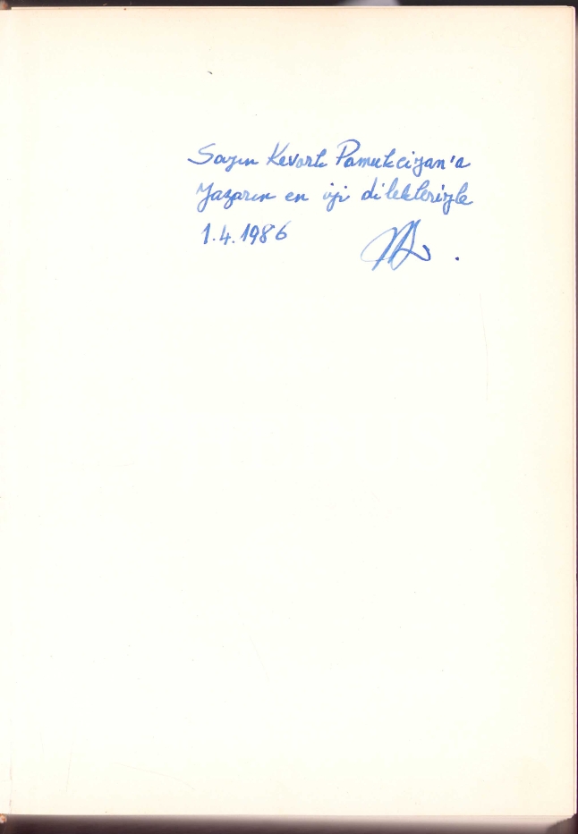 İthaf, "Sayın Kevork Pamukciyan'a yazarın en iyi dilekleriyle, 1.4.1986" şeklindedir.