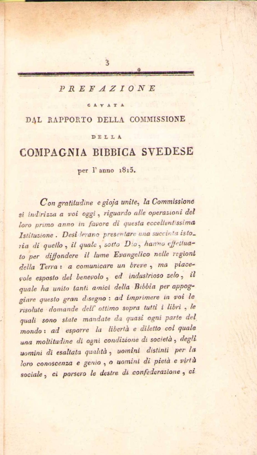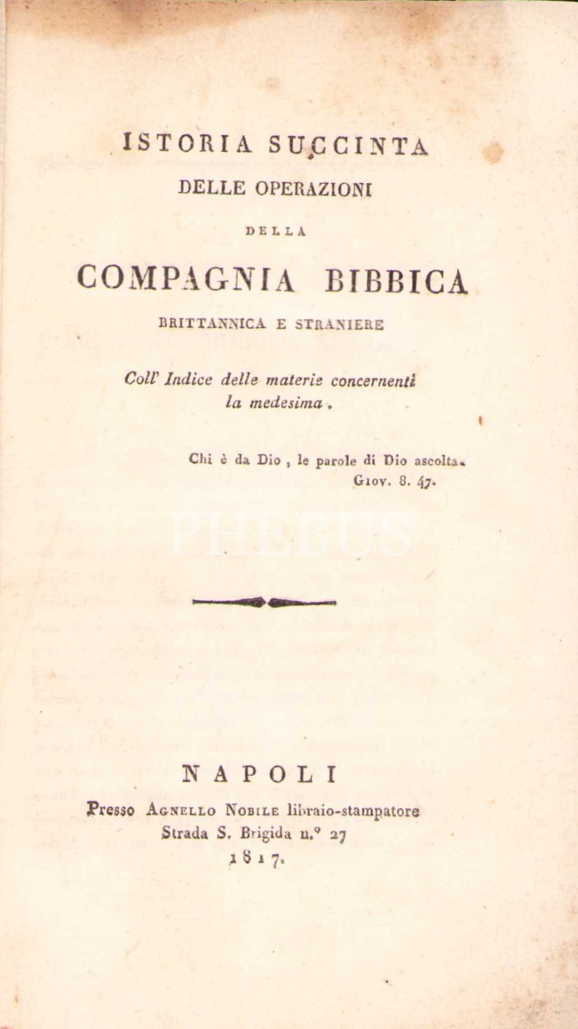 İtalyanca "Yabancı İncil Cemiyeti Faaliyetlerinin Kısa Tarihi", [Istoria succinta delle operazioni della Compagnia bibbica brittannica e straniere], Napoli 1817 Baskı, 72 sayfa, arka kapağı yıpranmış haliyle, 13x21 cm