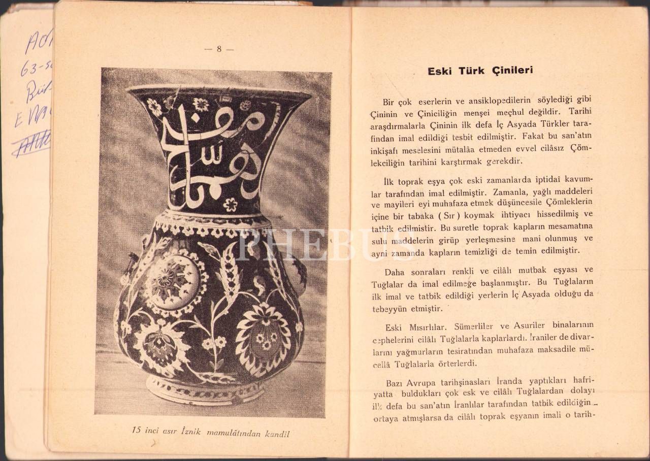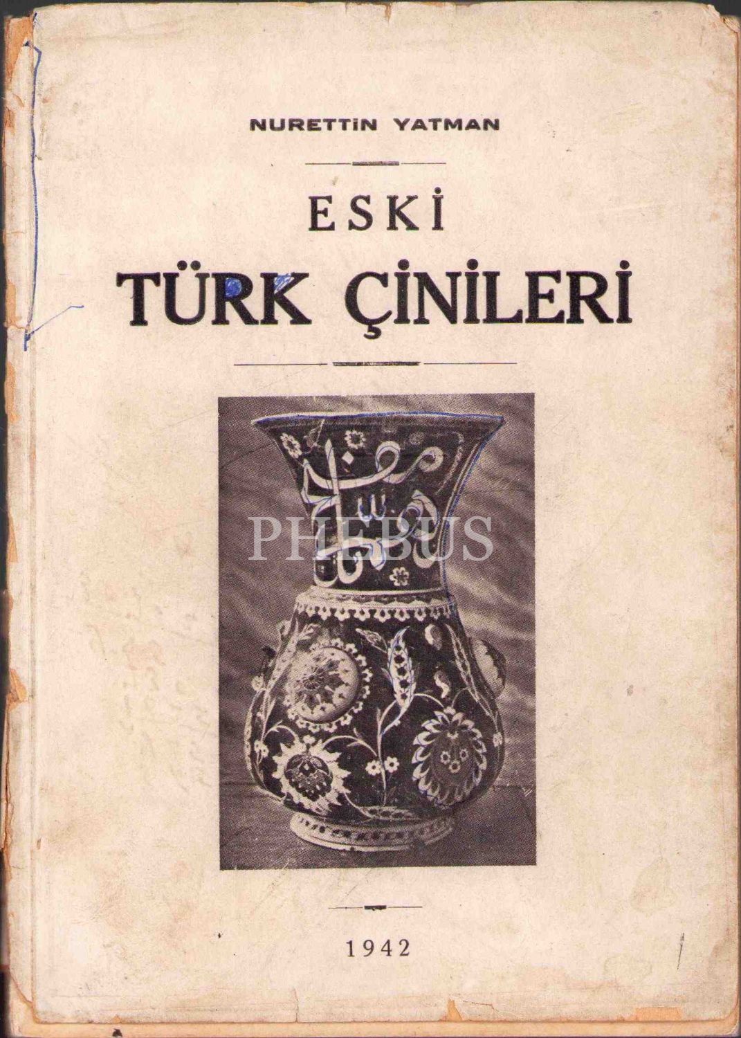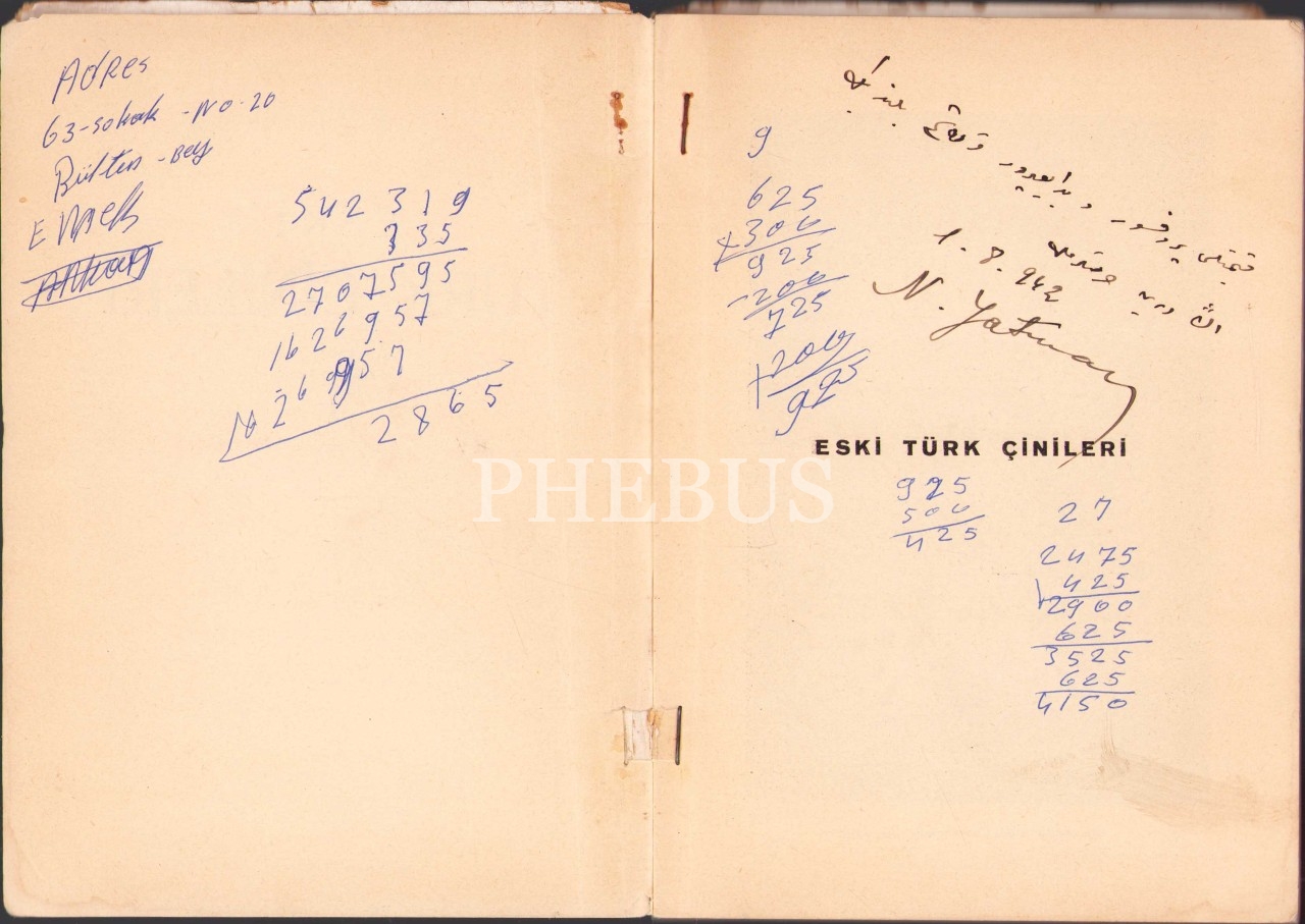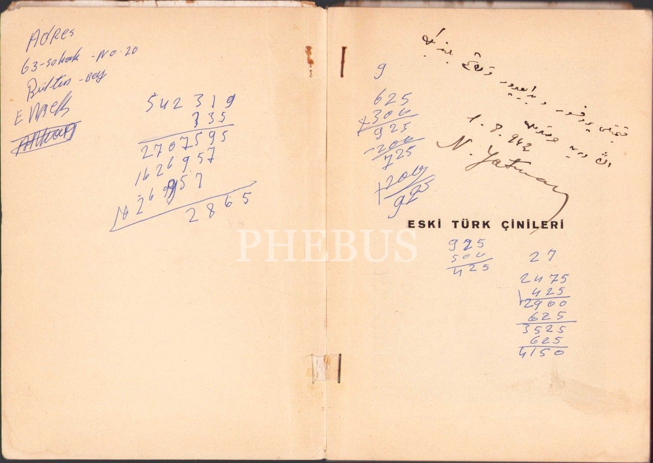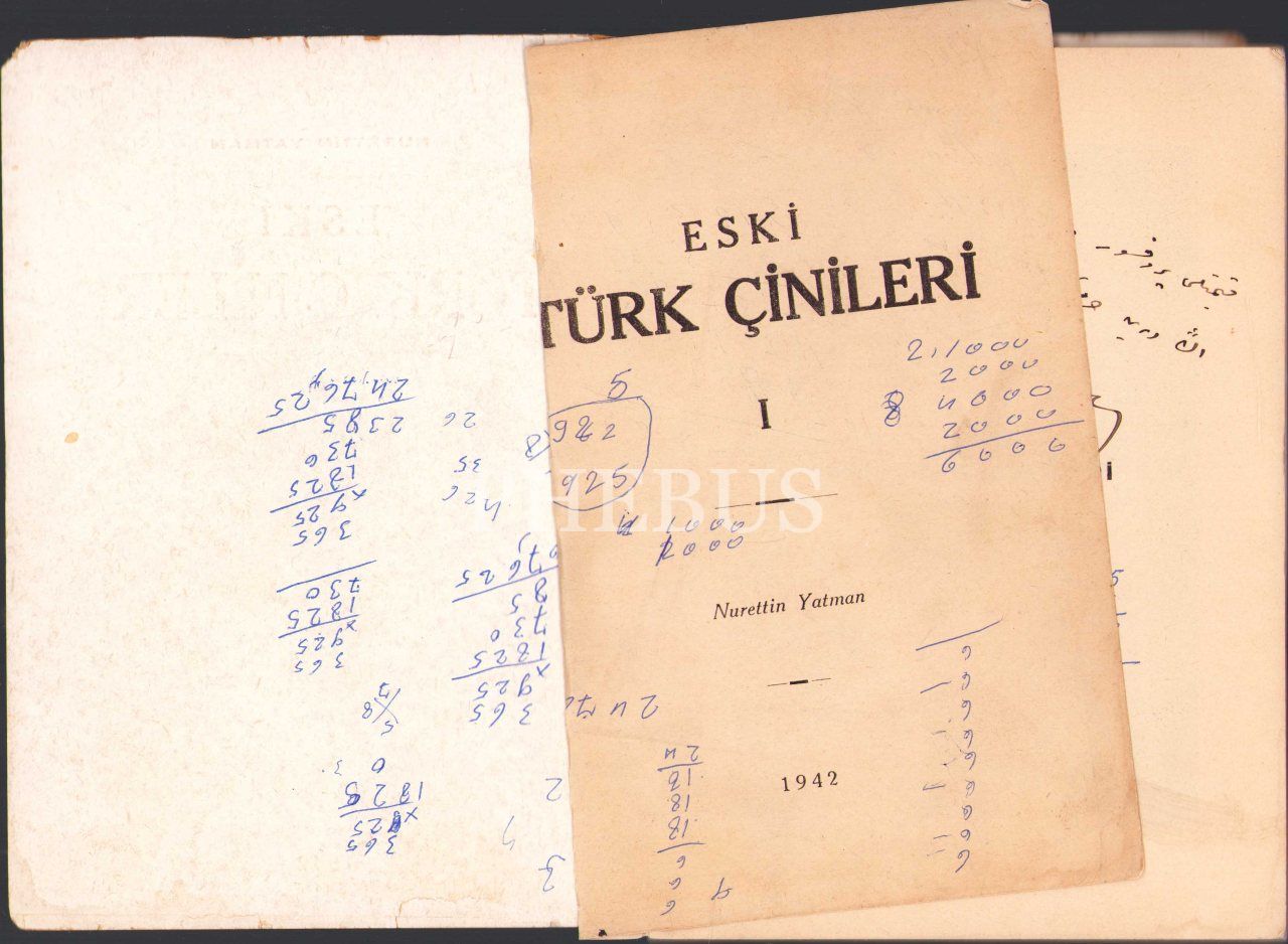 Antikacı Nurettin Yatman'dan Osmanlıca İmzalı ve İthaflı "Eski Türk Çinileri", Ankara Çankaya Matbaası 1942, 100 sayfa, kapağı yırtık haliyle, 14x20 cm