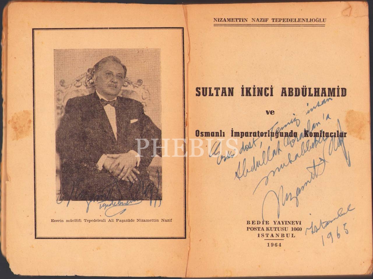 Gazeteci Nizamettin Nazif Tepedenlioğlu'ndan İmzalı ve İthaflı "Sultan İkinci Abdülhamid ve Osmanlı İmparatorluğu'nda Komitacılar", Bedir Yayınevi 1964, 557 sayfa, kapağı yıpranmış haliyle, 14x19 cm