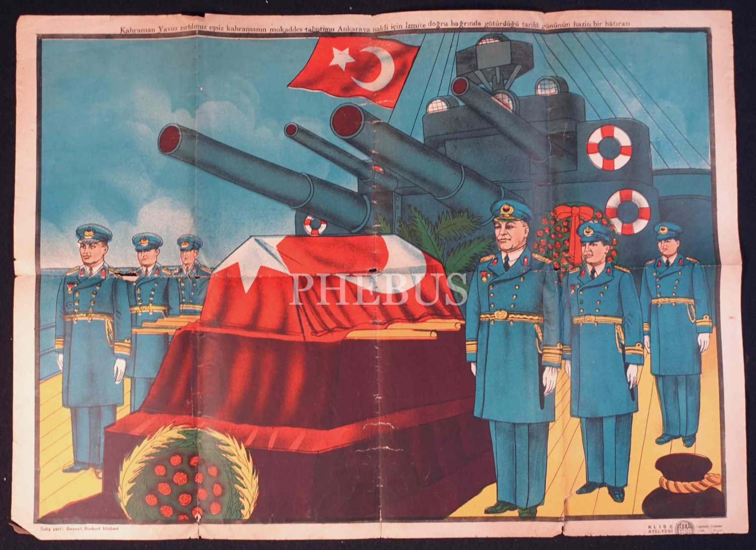 Atatürk'ün tabutunun Yavuz zırhlısıyla Ankara'ya nakledildiği günü resmeden poster, Klişe Atelyesi, 41x57 cm, kenarları yırtılmış haliyle