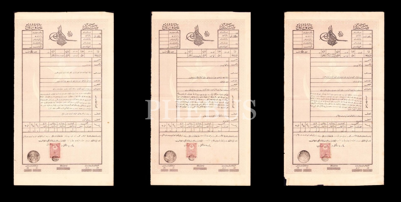 3 adet Sened-i Hakani antetli Osmanlıca arz-ı miri tarla tapu senedi, Çorum 1329, 24x41 cm