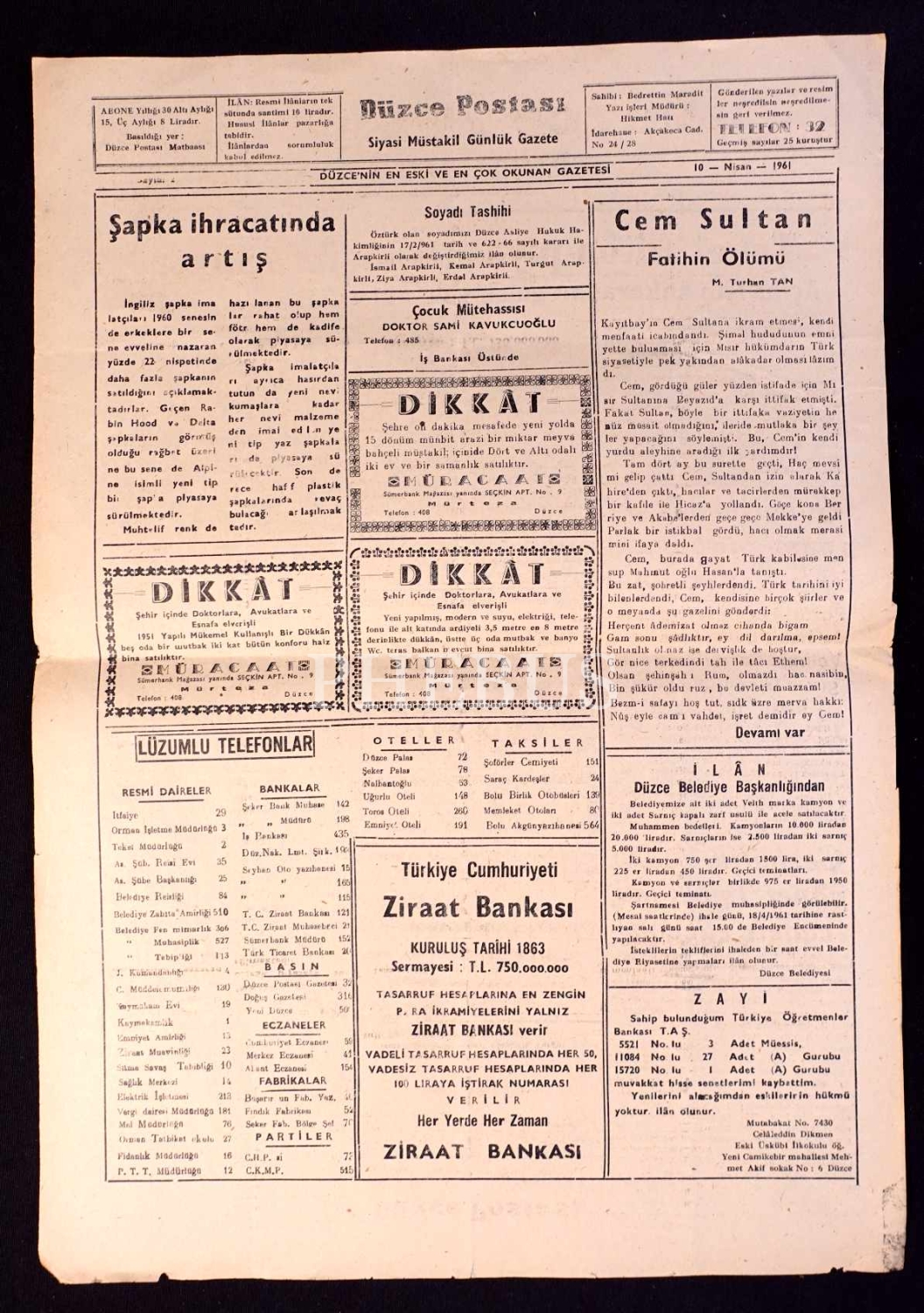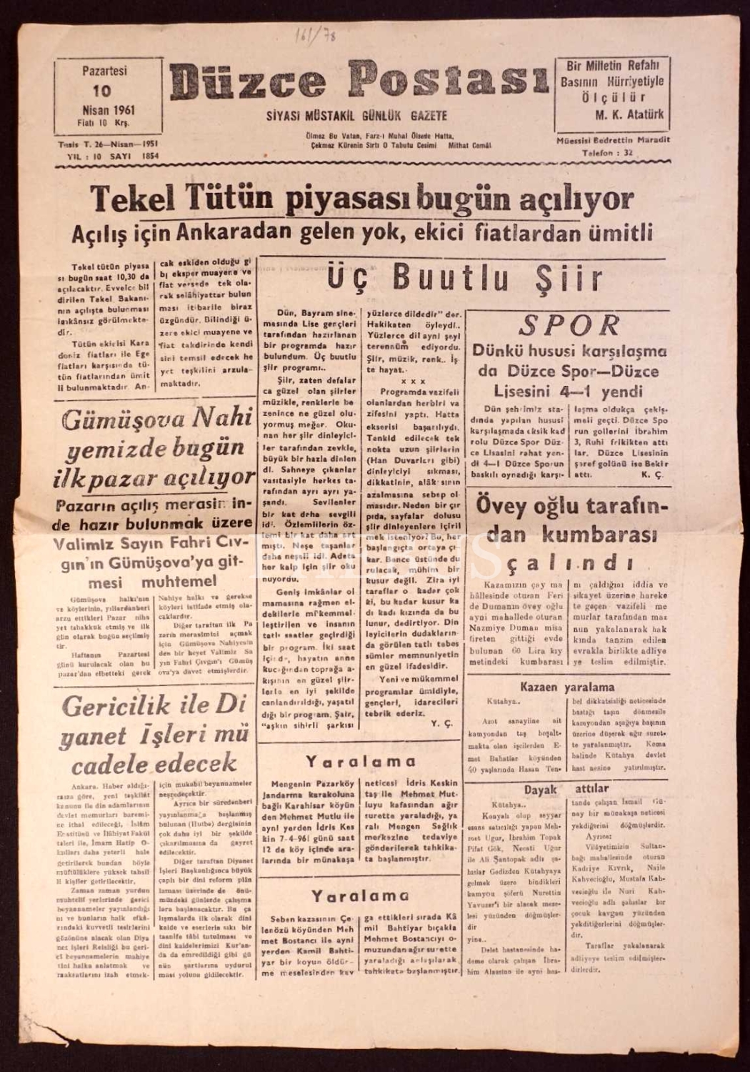 10 Nisan 1961 tarihli Düzce Postası gazetesi, tek sayfa, 35x50 cm