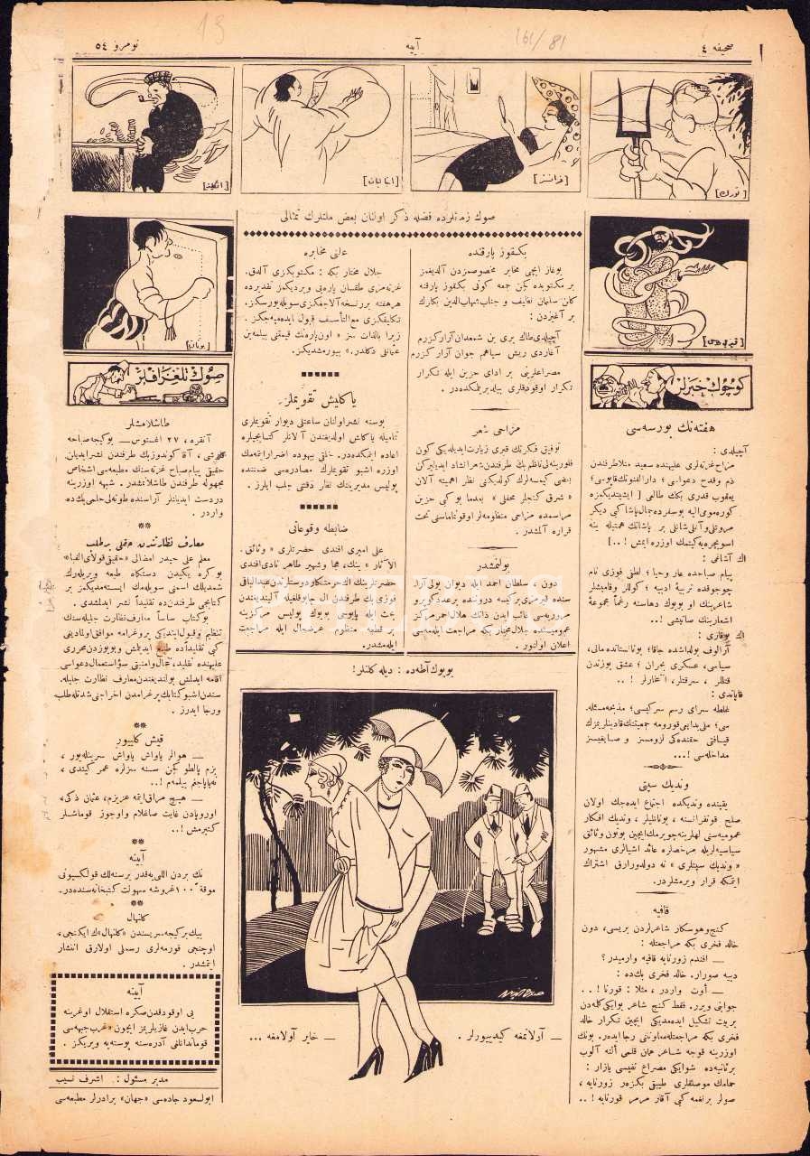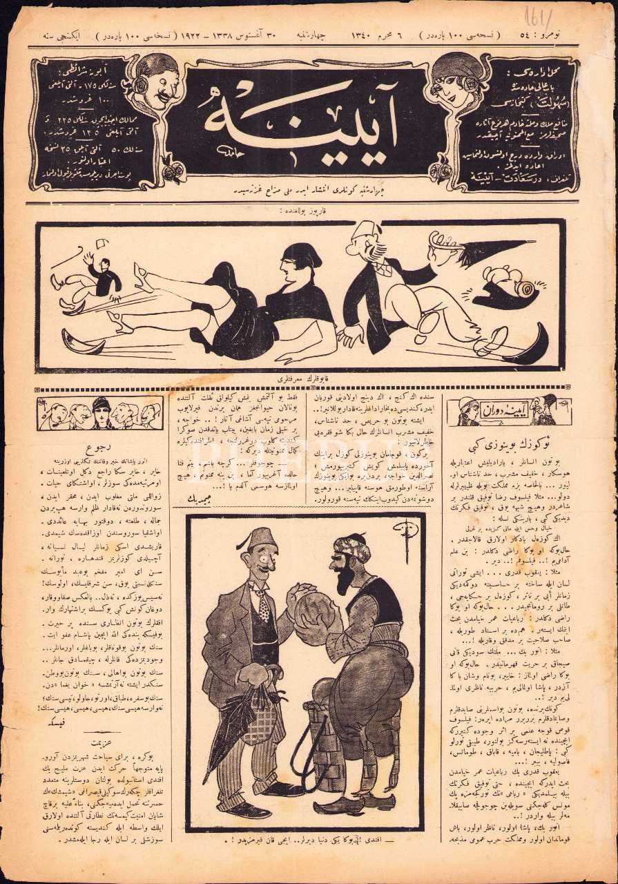 Osmanlıca Ayine mizah gazetesi 54. sayı, 30 Ağustos 1922, 28x40 cm, kenarları yıpranmış haliyle