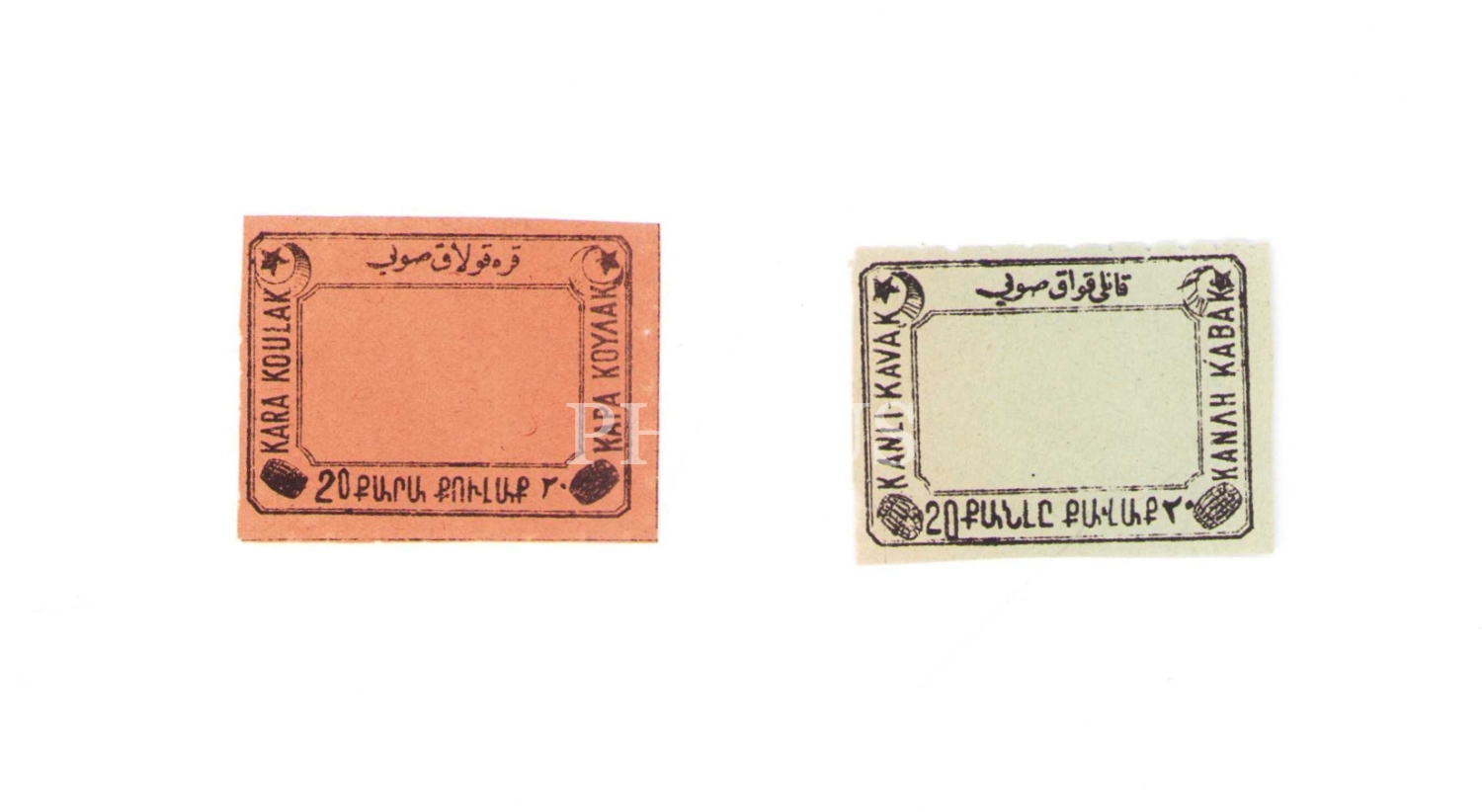 Osmanlıca-Ermenice-Rumca-Fransızca "Karakulak Suyu" ve "Kanlıkavak Suyu" pulları, 4x5 cm