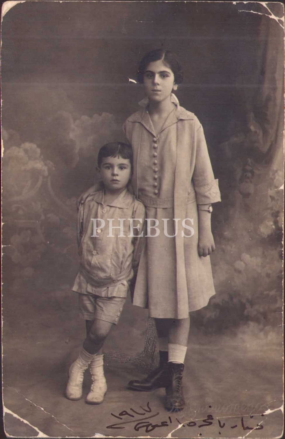 İki çocuğun 1917 tarihli hatıra fotoğrafı, N. Andriomenos soğuk damgalı, yıpranmış haliyle