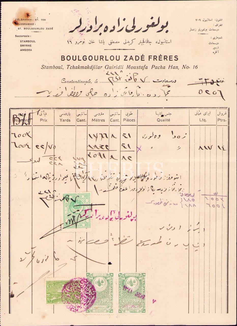 Osmanlıca-Fransızca Bulgurluzade Biraderler antetli fatura, İstanbul 1341, 20x28 cm, hafif yıpranmış haliyle