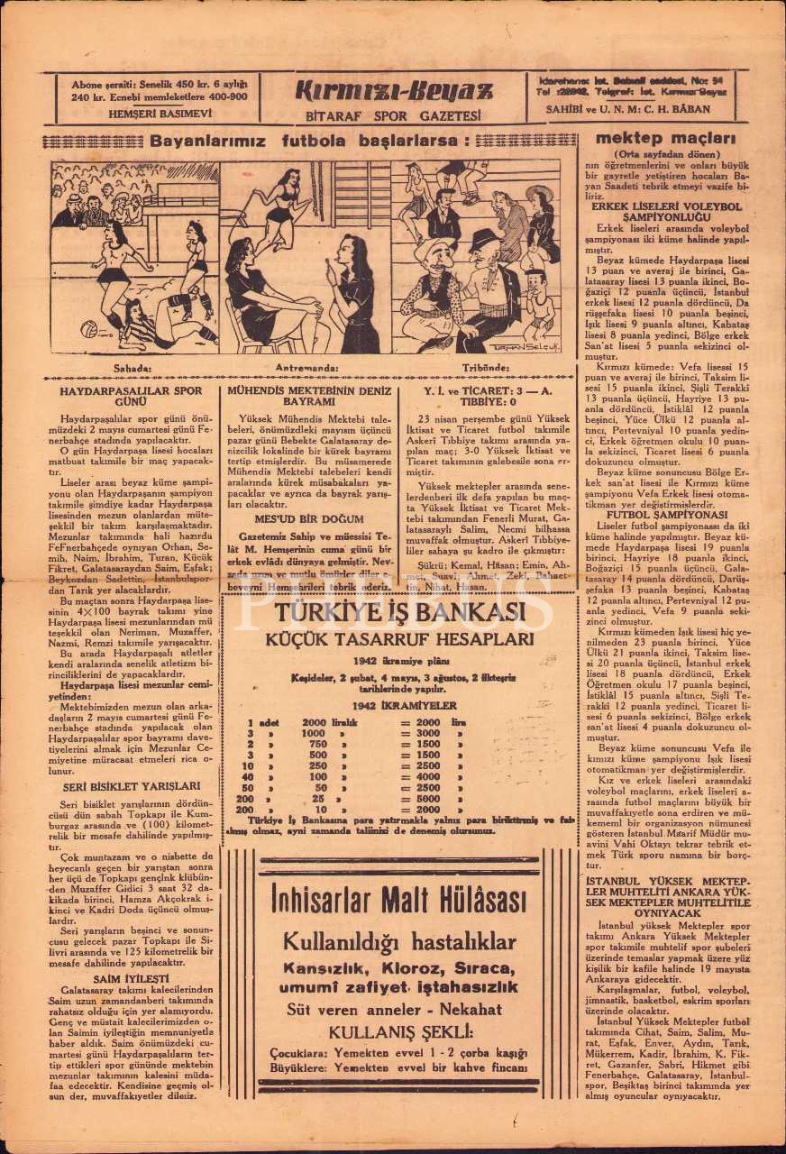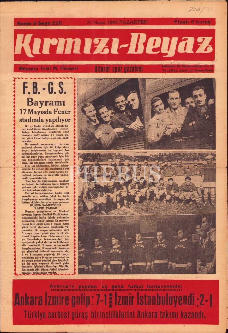 "Bitaraf spor gazetesi" Kırmızı-Beyaz'ın 228. sayısı, 27 Nisan 1942, 28x41 cm, kenarı yırtık haliyle