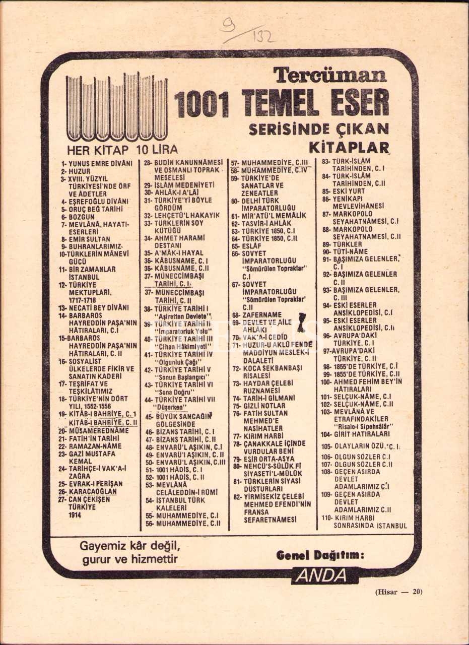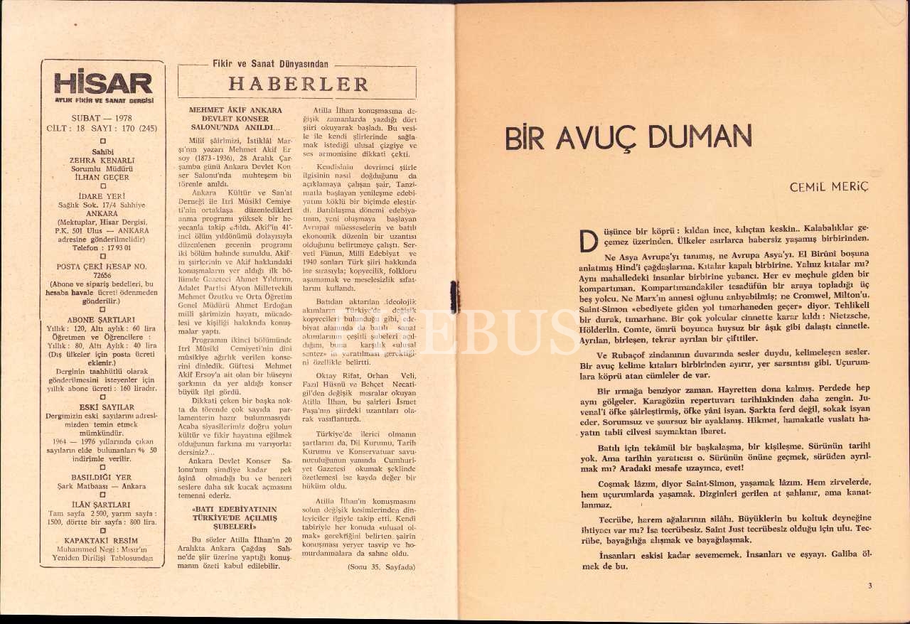 Fikir ve sanat dergisi Hisar'ın 170. sayısı, Şubat 1978, 20x27 cm