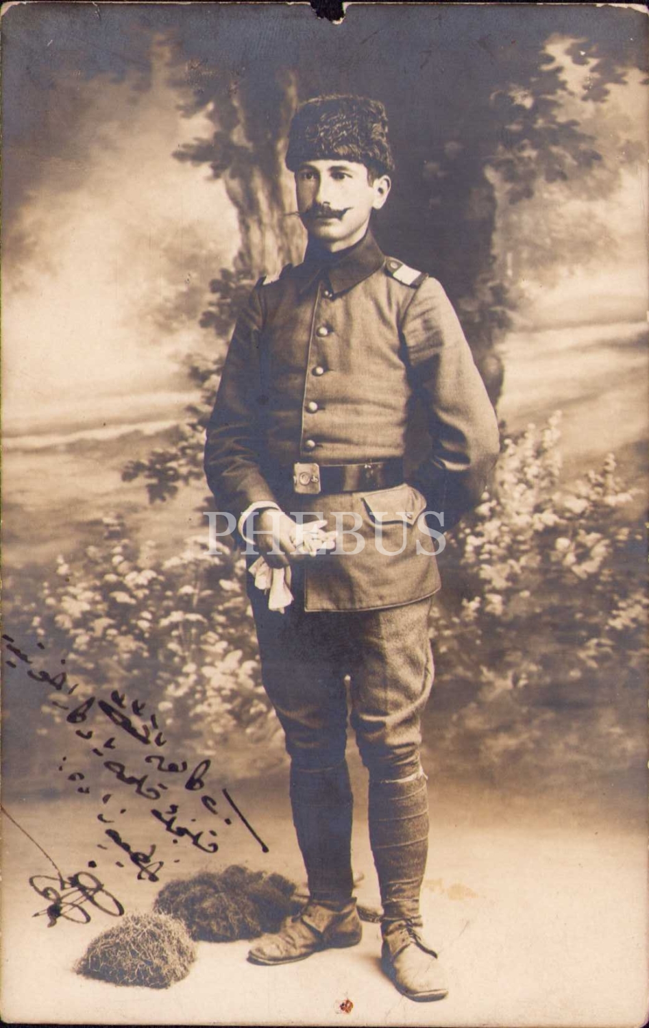 Subay Hatibzade'den 1331 tarihli hatıra fotoğrafı, arka yüzünde Osmanlıca mektup mevcut, üst kenarı yıpranmış haliyle