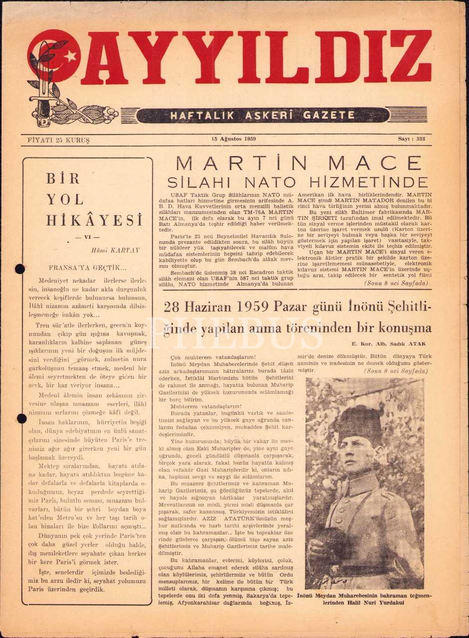Askerî gazete Ayyıldız'ın 333. sayısı, 15 Ağustos 1959, İnönü Meydan Muharebesi teğmenlerinden eski milletvekili Halil Nuri Yurdakul'a ait ön kapak görseliyle, 25x34 cm, sayfaları açılmamış ve kenarları hafif yıpranmış haliyle