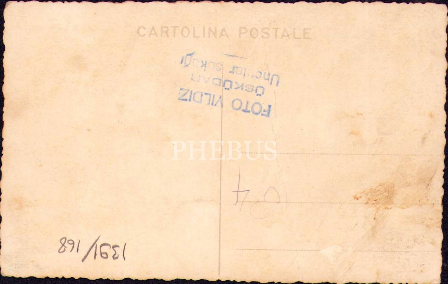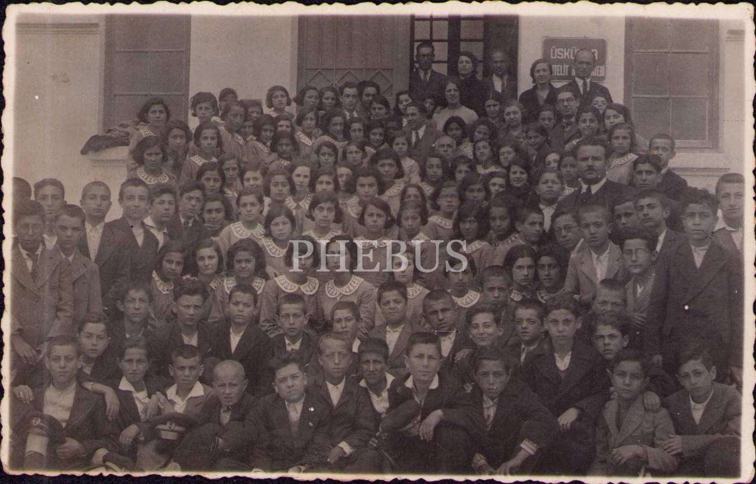 Üsküdar Muhtelit [Karma] Ortamektebi tabelası önünde toplu hatıra fotoğrafı, Foto Yıldız-Üsküdar, ortadan kırık haliyle