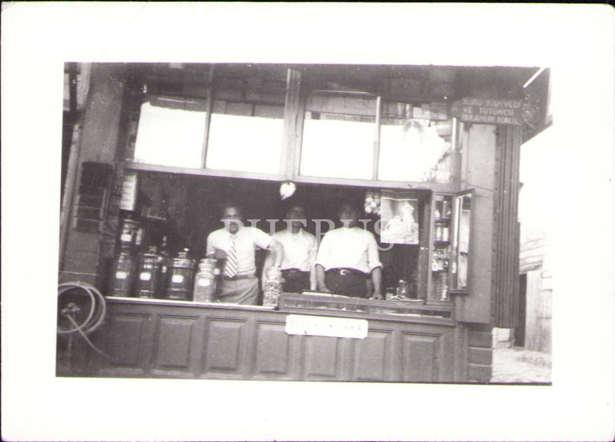 Kurukahveci ve Tütüncü İbrahim Halil dükkânında hatıra fotoğrafı, 7x10 cm, alt köşesi kırık haliyle