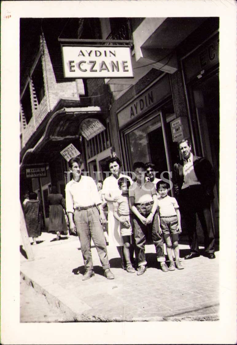 Aydın Eczanesi önünde toplu hatıra fotoğrafı, 6x9 cm, üst kenarı hafif yıpranmış haliyle