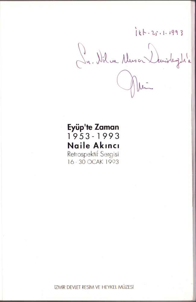 Eyüp'te Zaman (1953-1993)-Retrospektif Sergisi, Naile Akıncı, ithaf ve imzalı, İzmir Devlet Resim ve Heykel Müzesi, 95 s., 16x24 cm