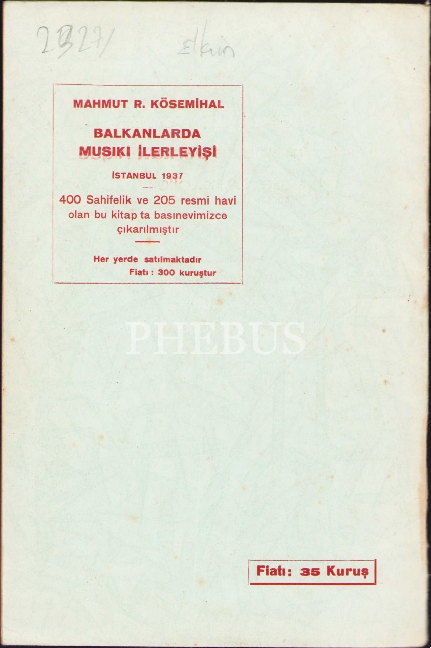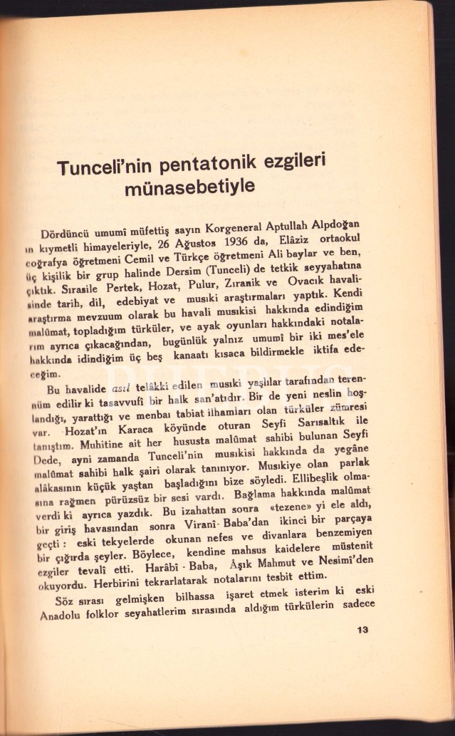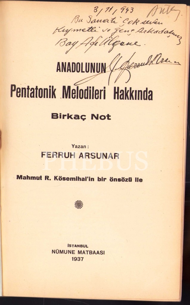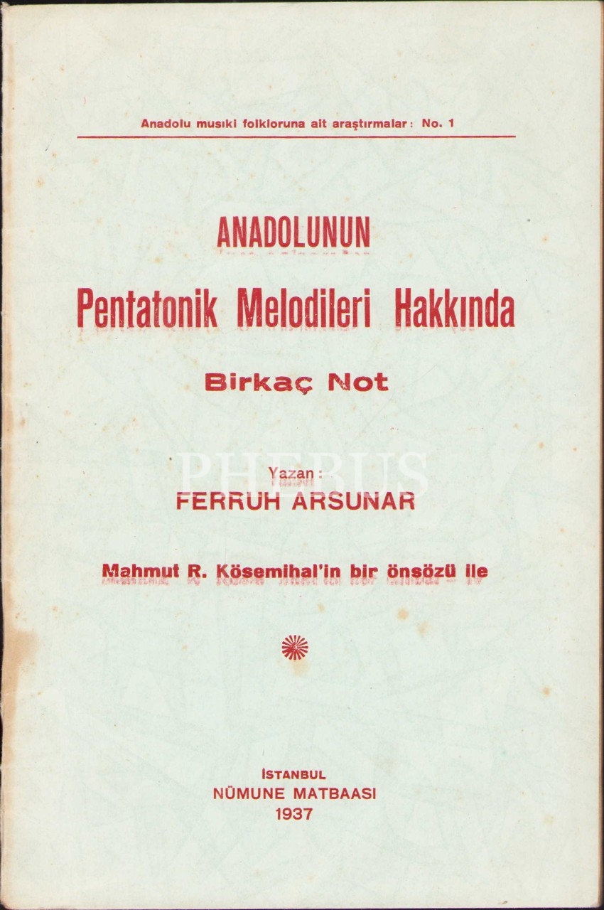 Anadolunun Pentatonik Melodileri Hakkında Birkaç Not, Ferruh Arsunar, yazarından ithaf ve imzalı, Nümune Matbaası, İstanbul 1937, 30 s., 15x23 cm