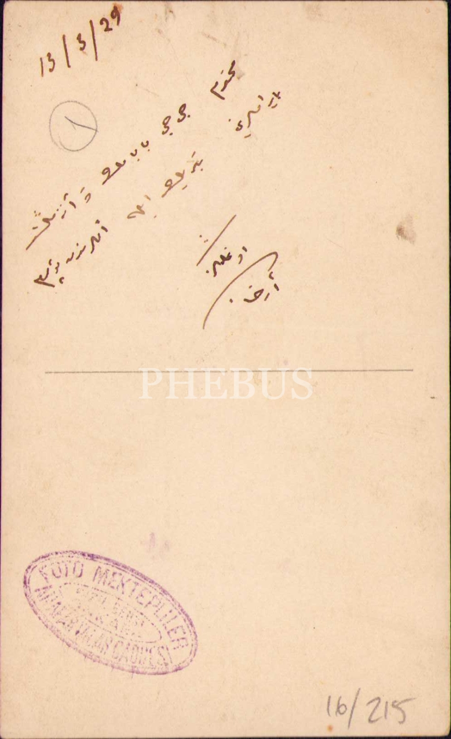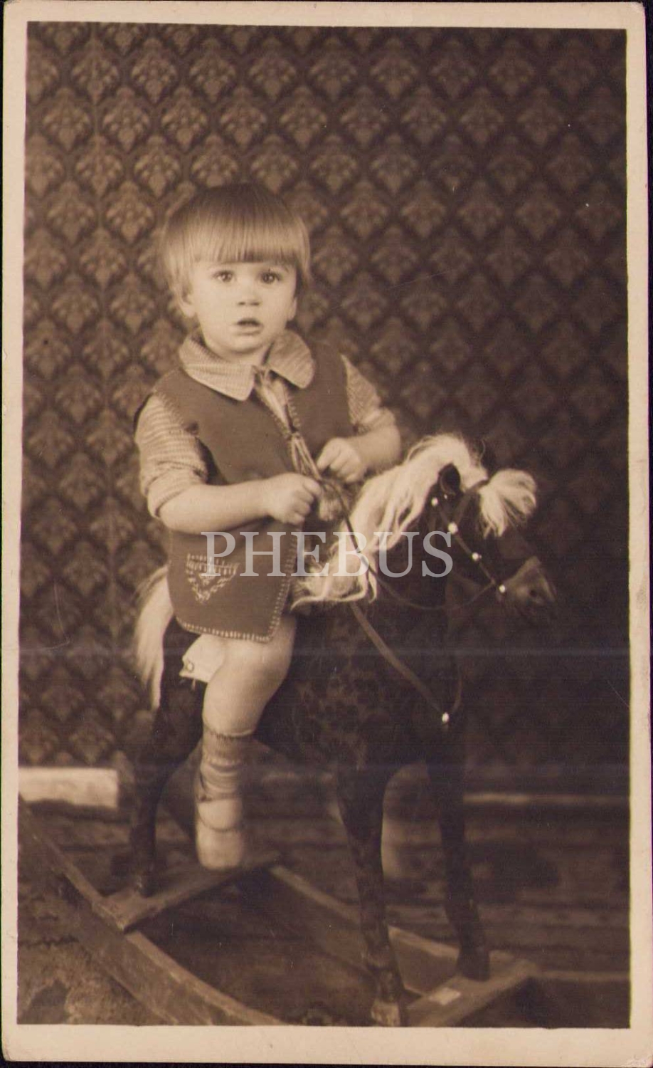 Oyuncak at üzerinde poz veren sevimli erkek çocuğu, 1929 tarihli Osmanlıca ithaf yazısıyla, köşeleri hafif soyulmuş haliyle
