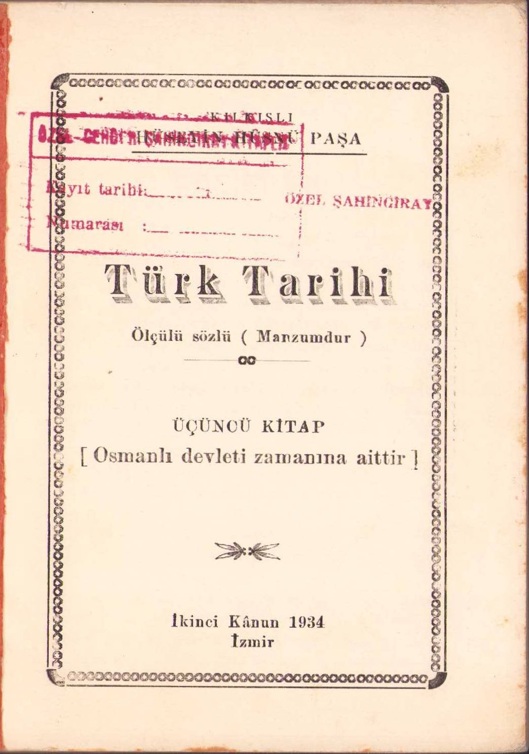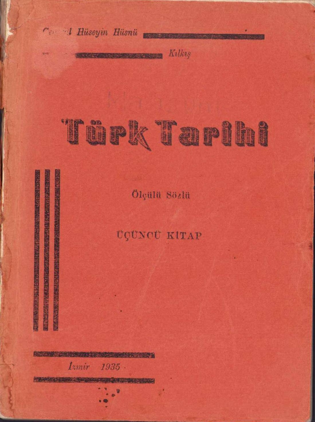 Türk Tarihi - Üçüncü kitap, Cemal Hüseyin Hüsnü, İzmir, 1935, cilt sırtı haliyle, 121 sayfa, 14x19cm