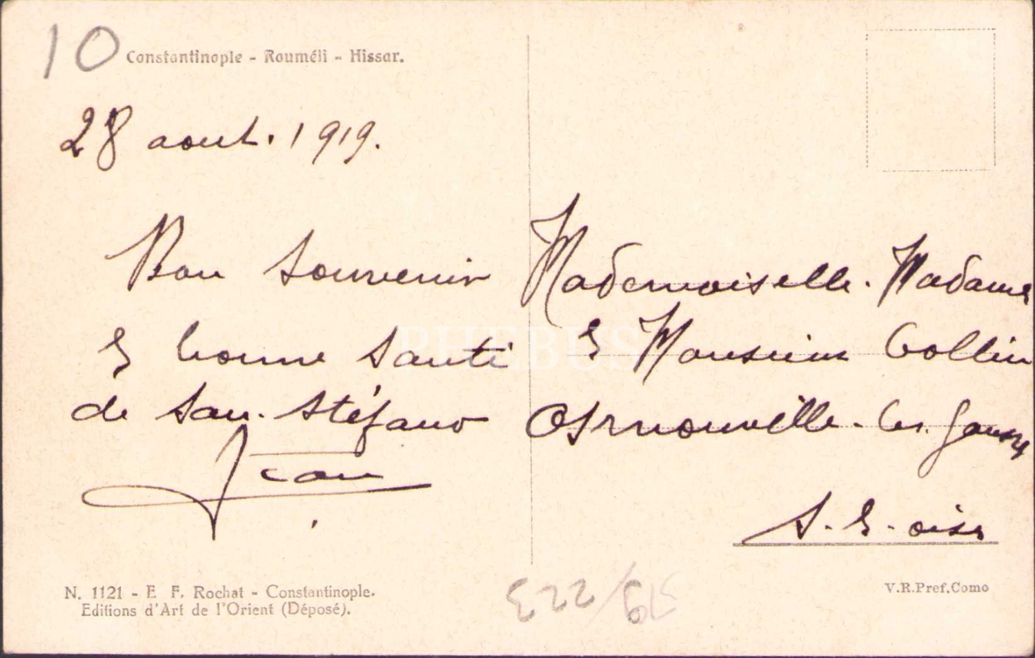 Rumeli Hisarı/Constantinople, E.F. Rochat, arkasında 1919 tarihli Fransızca mektup mevcut