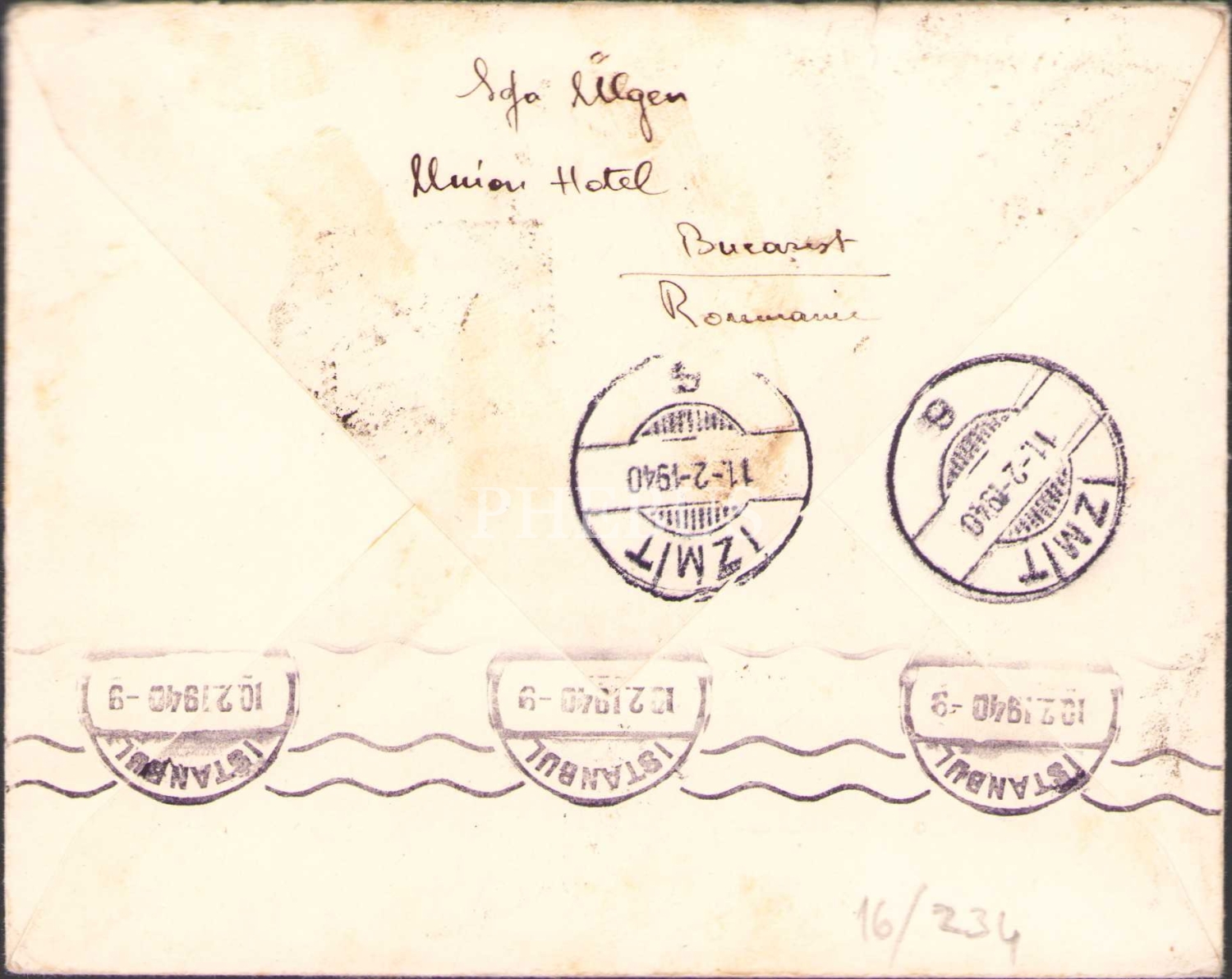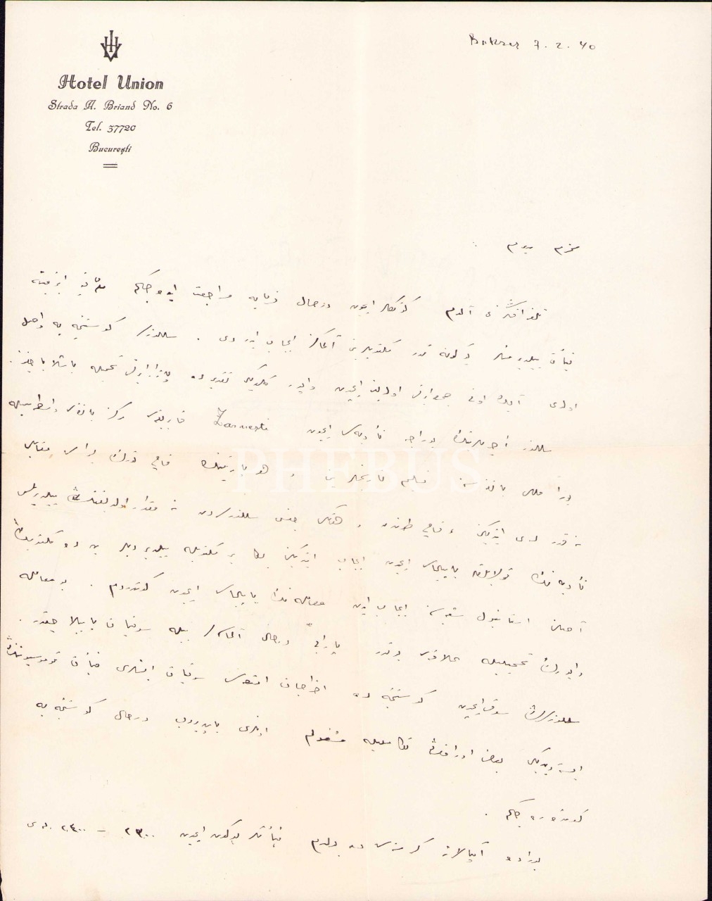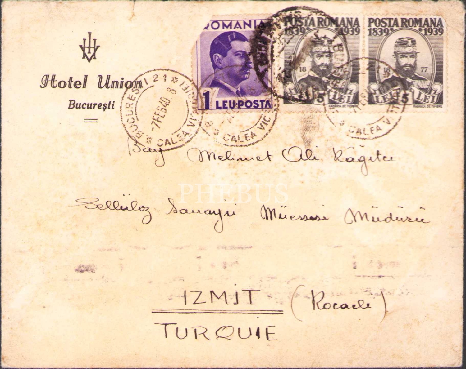 "Selüloz Sanayi Müessesesi Müdürü" Mehmet Ali Kâğıtçı'ya oğlu tarafından yazılan 1940 tarihli Osmanlıca mektup ve zarfı, Hotel Union-Bucureşti/Bükreş antetli, zarf: 12x15 cm ve hafif yıpranmış haliyle