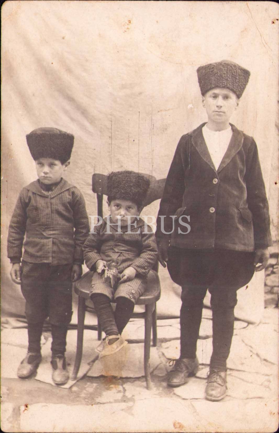 Kalpaklı erkek çocuklarının hatıra fotoğrafı, arkası Osmanlıca yazılı, yıpranmış haliyle