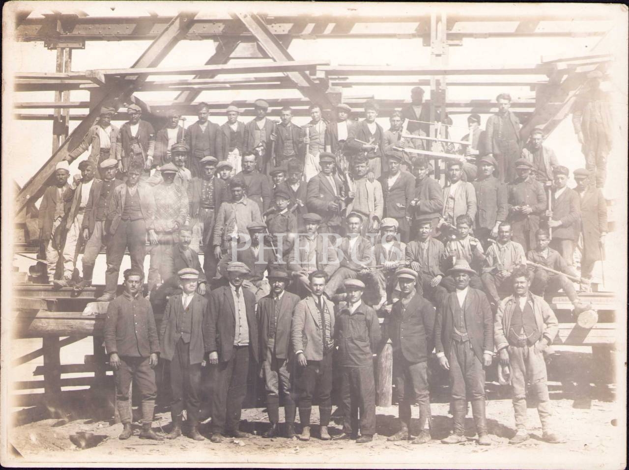 İnşaat işçileri ile hatıra fotoğrafı, 18x24 cm, hafif yıpranmış haliyle