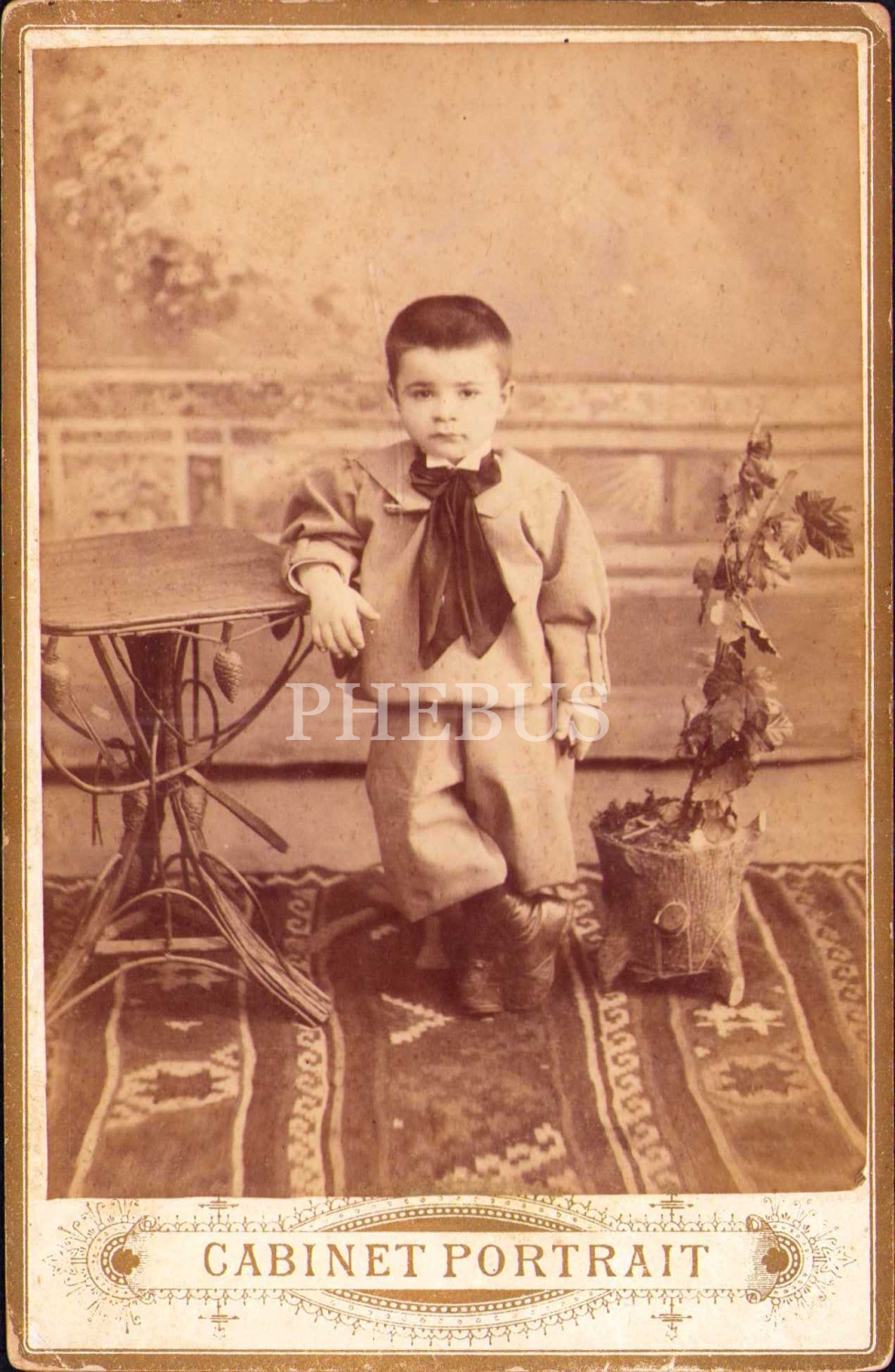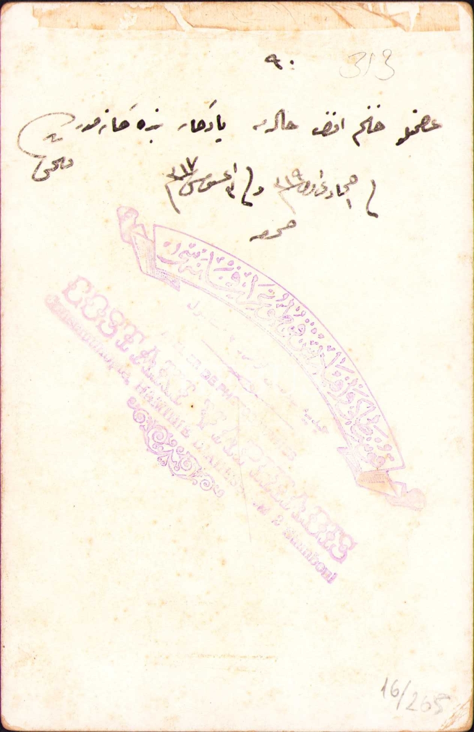 Erkek çocuğu kabin fotoğrafı, Costaki Vaphiadis Fotoğrafhanesi-Constantinople, 1319 tarihli Osmanlıca ithaf yazısıyla, 11x16 cm