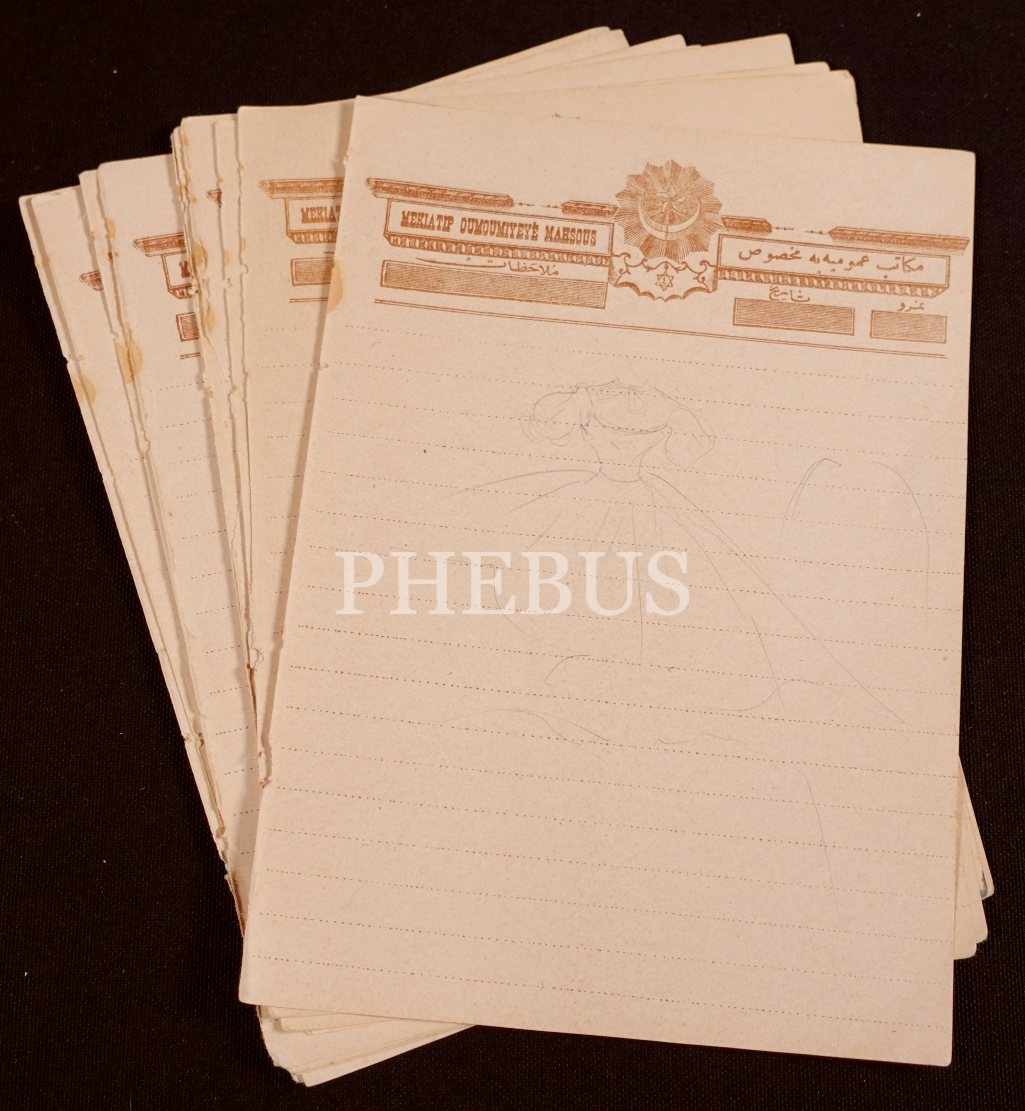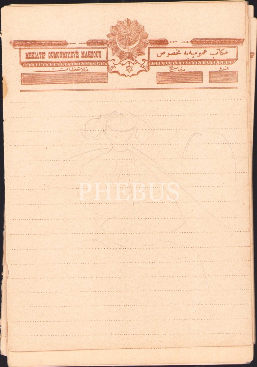 Osmanlı ve Latin harfleriyle "Mekatib-i Umumiyeye Mahsus" antetli 12 adet boş kâğıt, defterden çıkma, 14x20 cm