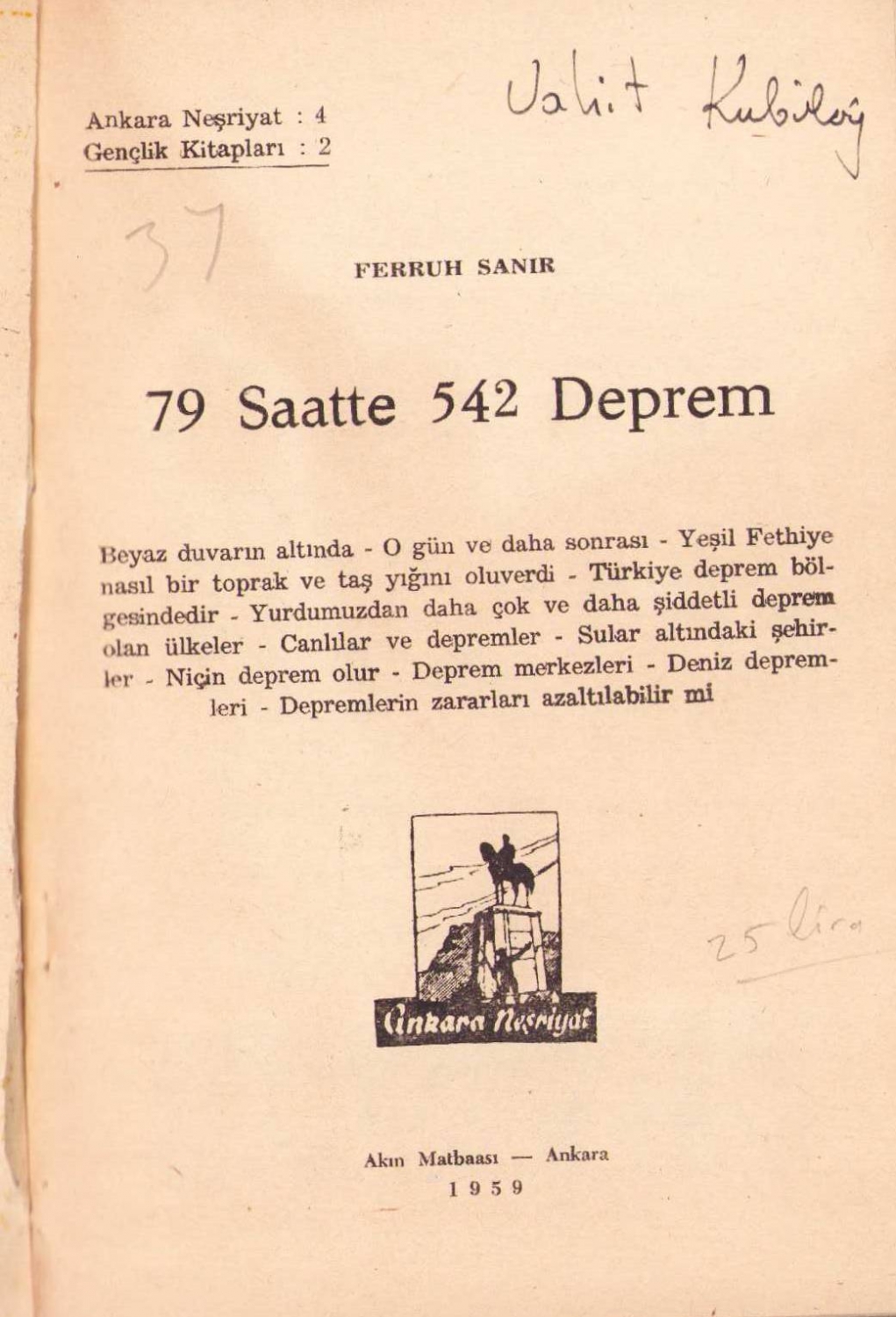 79 Saatte 542 Deprem, Ferruh Sanır, Ankara, 1959, resimli, haritalı, 30 sayfa, 13x20cm